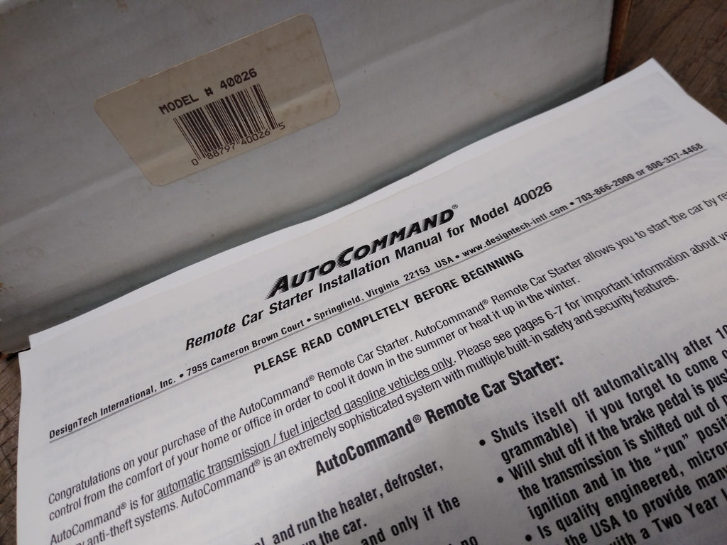 ***PLEASE LOOK AT ALL THE PICTURES AND ASK QUESTIONS BEFORE BIDDING*** This is a Vintage Design Tech Auto Command Remote Car Starter Model 40026 w/Instructions & Box, Untested *** The pictures are a substantial part of the description so please examine all the photos and contact me if you have any questions. We will be happy to save you shipping costs by picking this up at our shop. Thank You 120925-03-RK