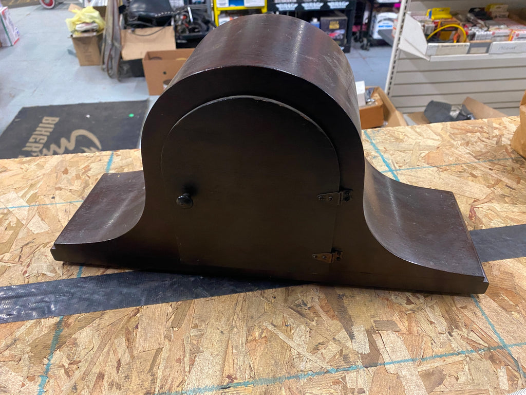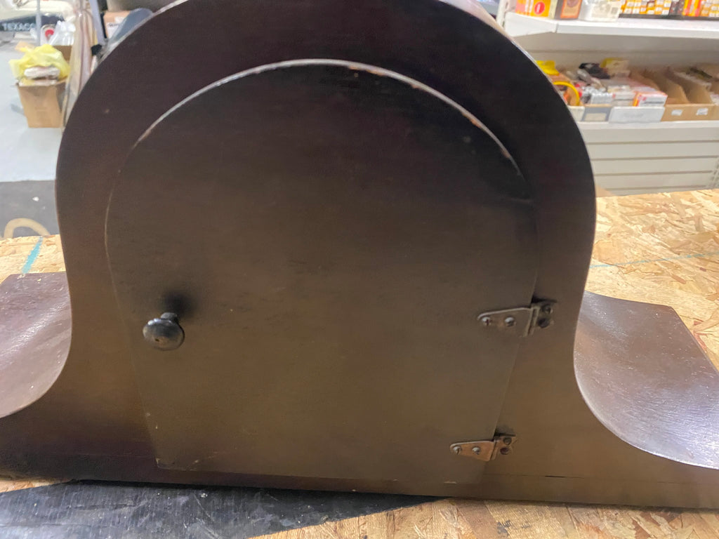 Type: Vintage wind-up mantle clock, sometimes referred to as a camelback or tambour style.