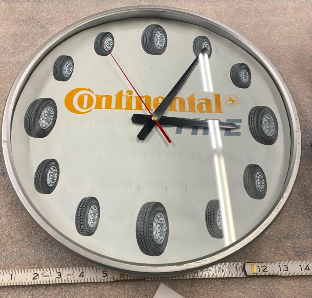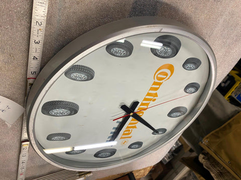 Continental Tire Wall Clock Advertising Auto Truck Motorcycle 14" Gas OIl Petroliana collector put a new battery in it, piece of metal for contact snapped off..... was messing with it & second hand fell off...... so its cheap can put a new motor in or solder a piece of metal in or just use for a display.....