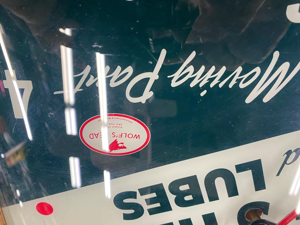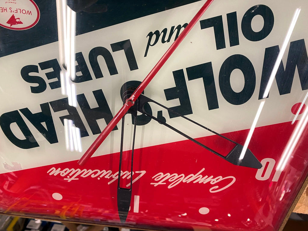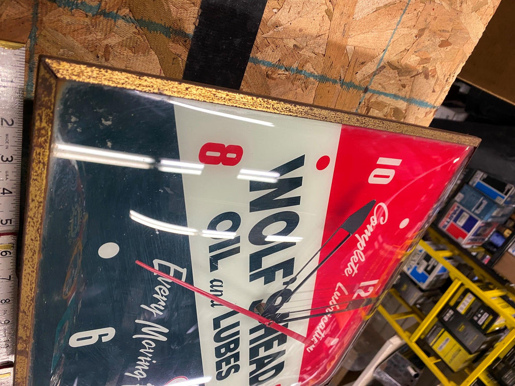 Vtg Wall PAM Clock Advertising Wolfs Head Oil Gas Can Petroliana Service Station