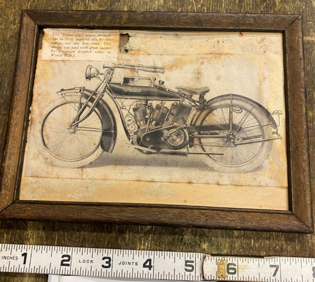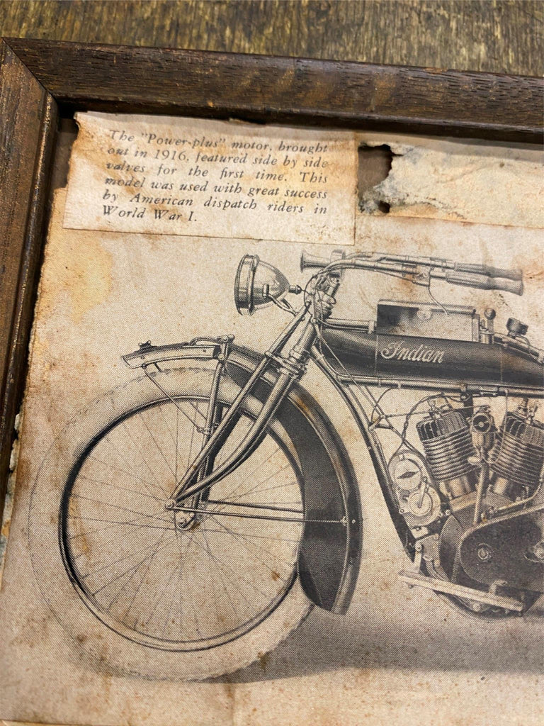 1916 Indian Power Plus Hendee Motorcycle Picture framed Antique Twin Vtg Classic bought a bunch of antique literature, books, pictures etc from an old dealer in ca looks like this was hanging around for a millenium!
