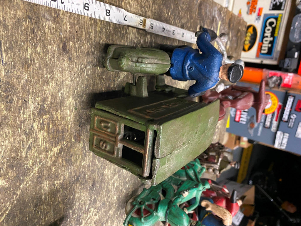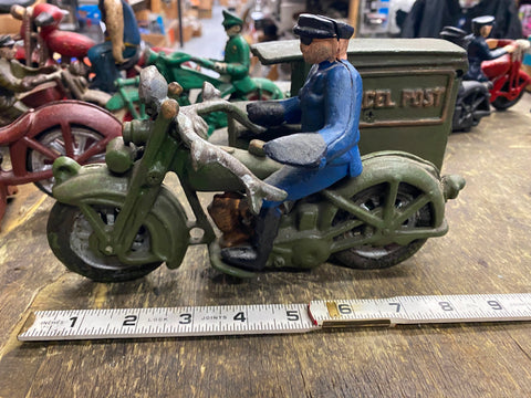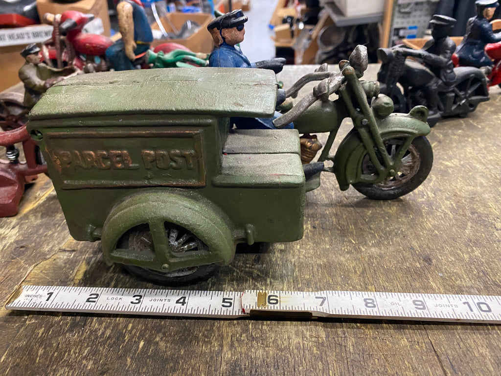 Harley Parcel Post Office USPS Motorcycle Figurine Cast Iron Toy Hubley 9" Acc! believe its a repop, champion or hubley or repop selling off a bunch of cast iron motorcycle toys from an estate! some nice stuff!!