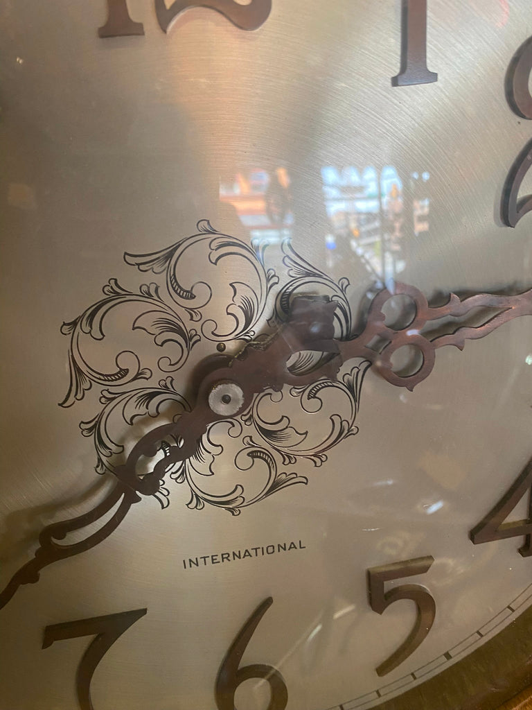 International Clock, Red Brass Wall Antique Electric Antique Vtg Victorian Curved glass face.. heavy, very nice face! Bought a bunch of vintage clocks from an estate, guess the guy was collecting clocks for almost 70 years... never sold any..... check out our other listings!! some really cool stuff on there... untested.