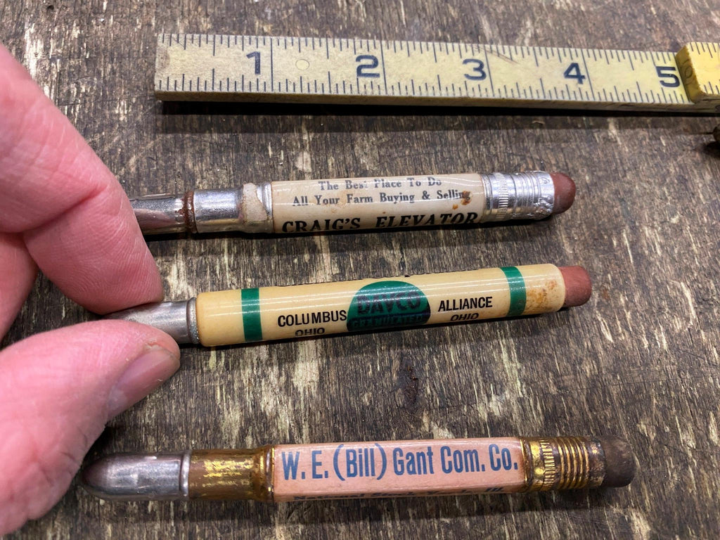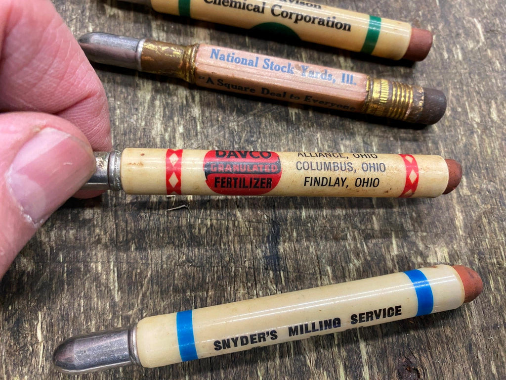 Lot Vtg Advertising Mini Bullet Pencils. Fertilizer Elevator Stock yard Milling. Have some different lots of them. Tried to sort into like sections. Pulls apart has a small pencil inside lot #3