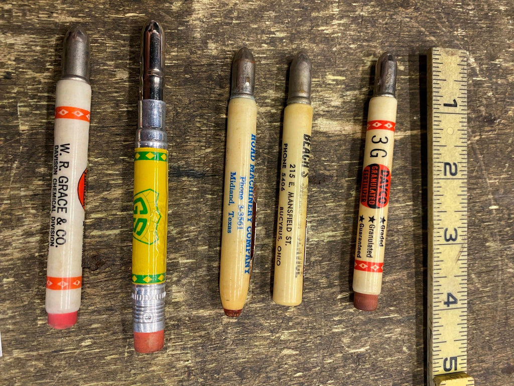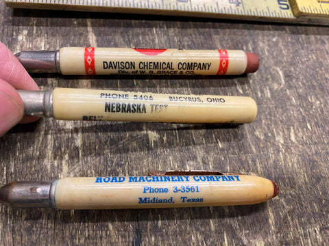 Lot Vtg Advertising Mini Bullet Pencils. Road machinery Davco GS GRACE Chemical. Have some different lots of them. Tried to sort into like sections. Pulls apart has a small pencil inside lot #5