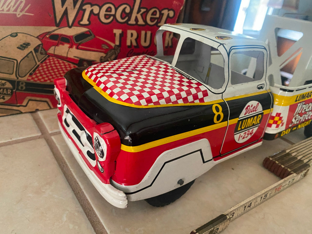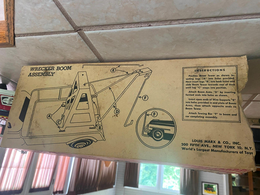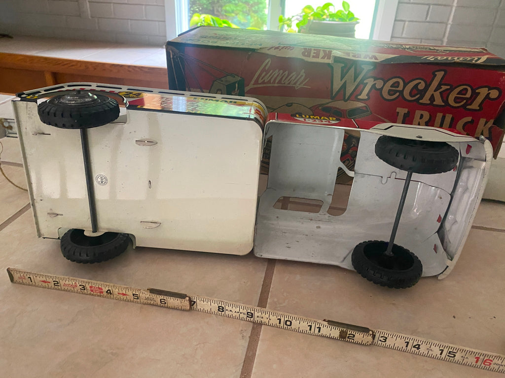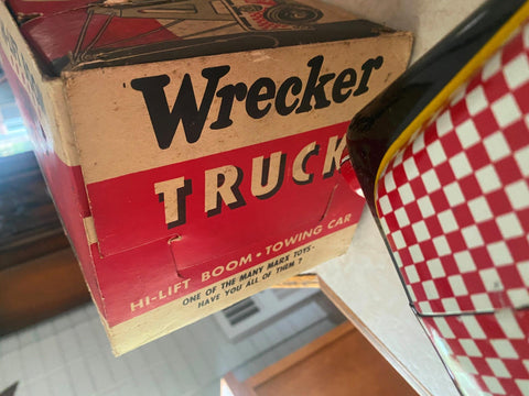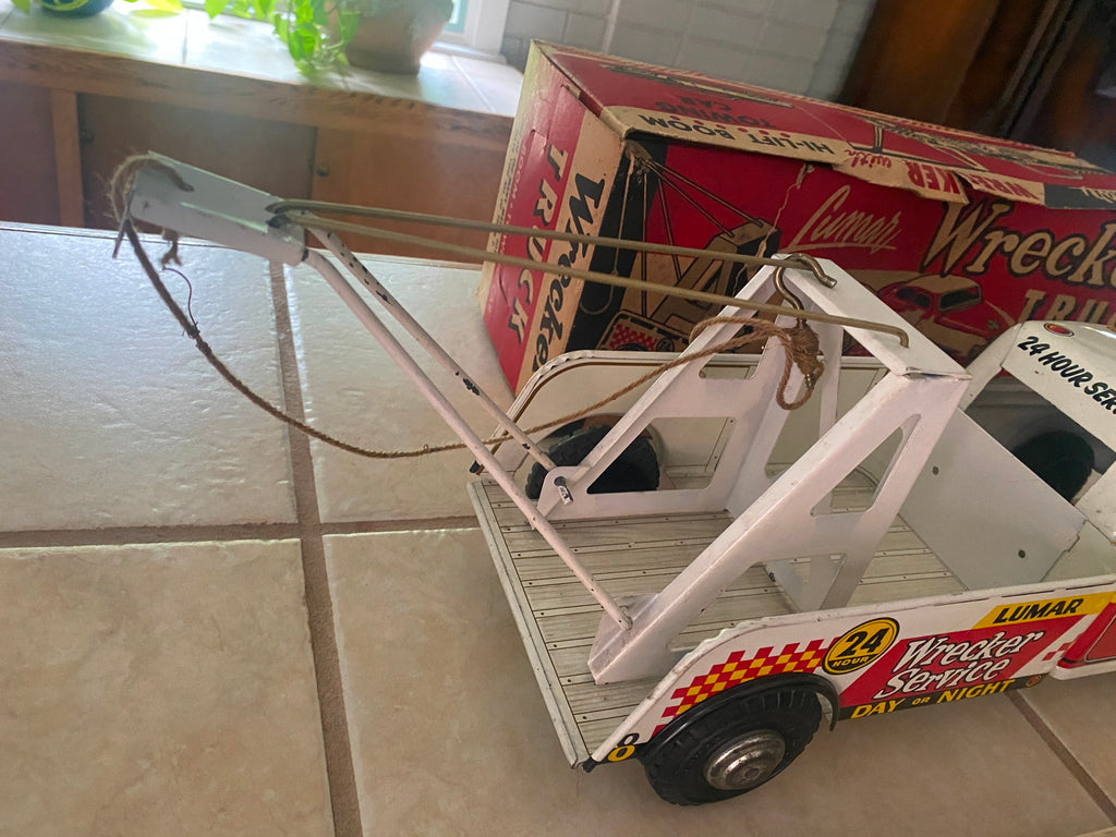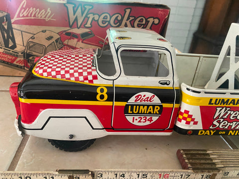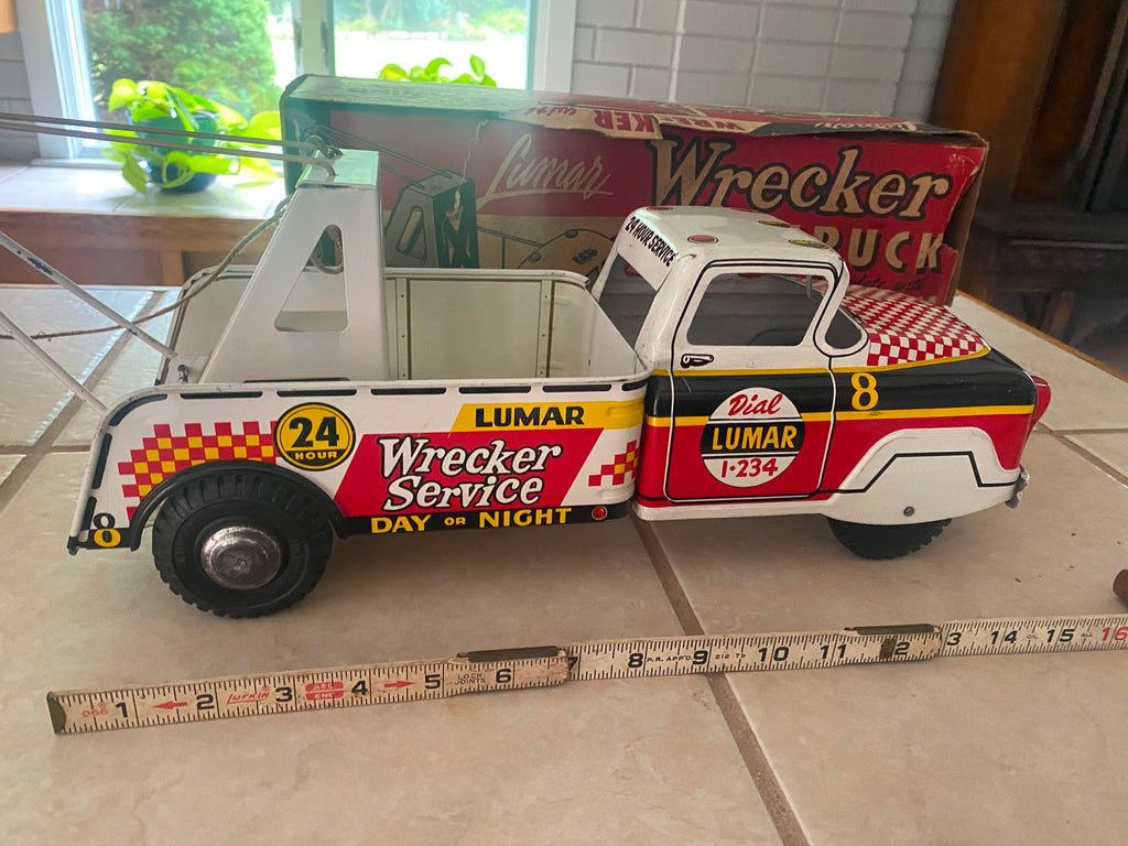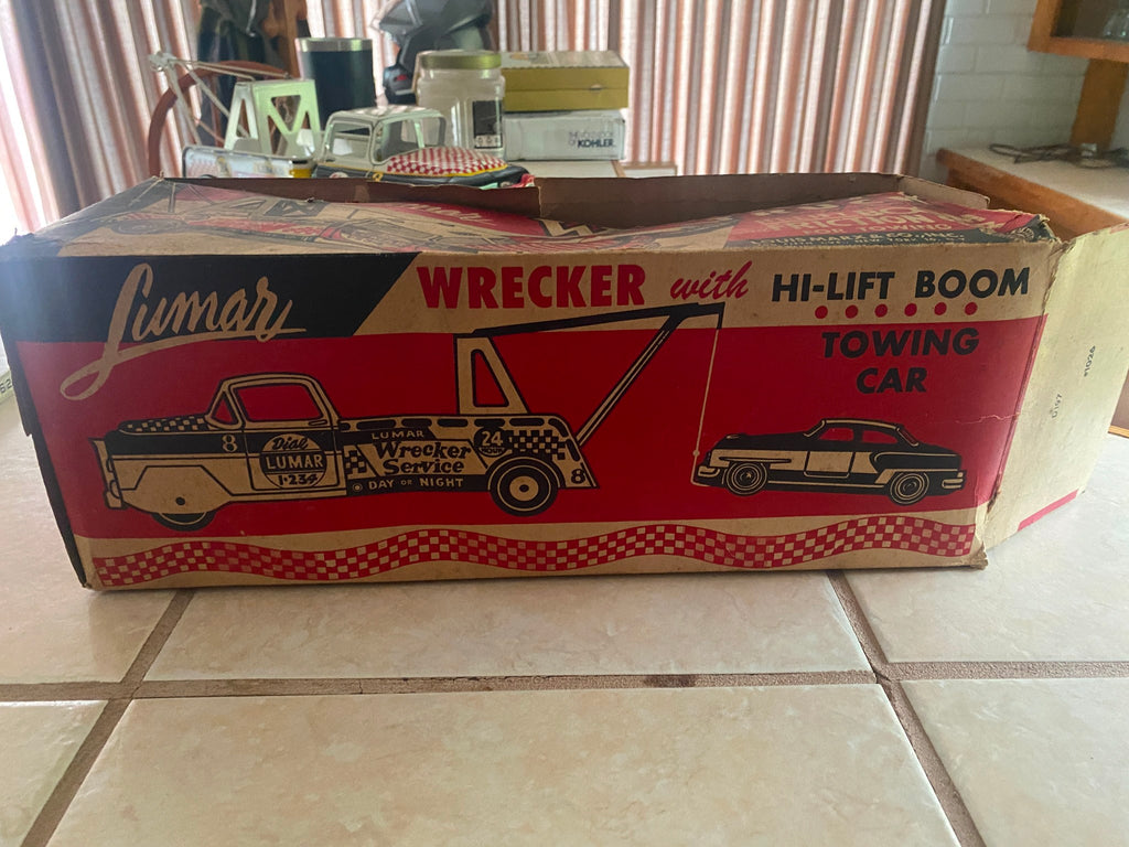 Lumar Marx Tin Toy Truck Pressed Steel 50's Wrecker Tow Truck 16" Orig Box Minty! Nicest one of these trucks Ive ever seen!!! looks just about unplayed with! Great piece for the toy collector!! buddy of mine his dad passed in his nineties, had an antique store for 50+ years, never sold any of the good stuff!!! Been picking up a few pieces from the family as I can have some great stuff listed!!! sorry it is expensive, not real easy buying this stuff!!!