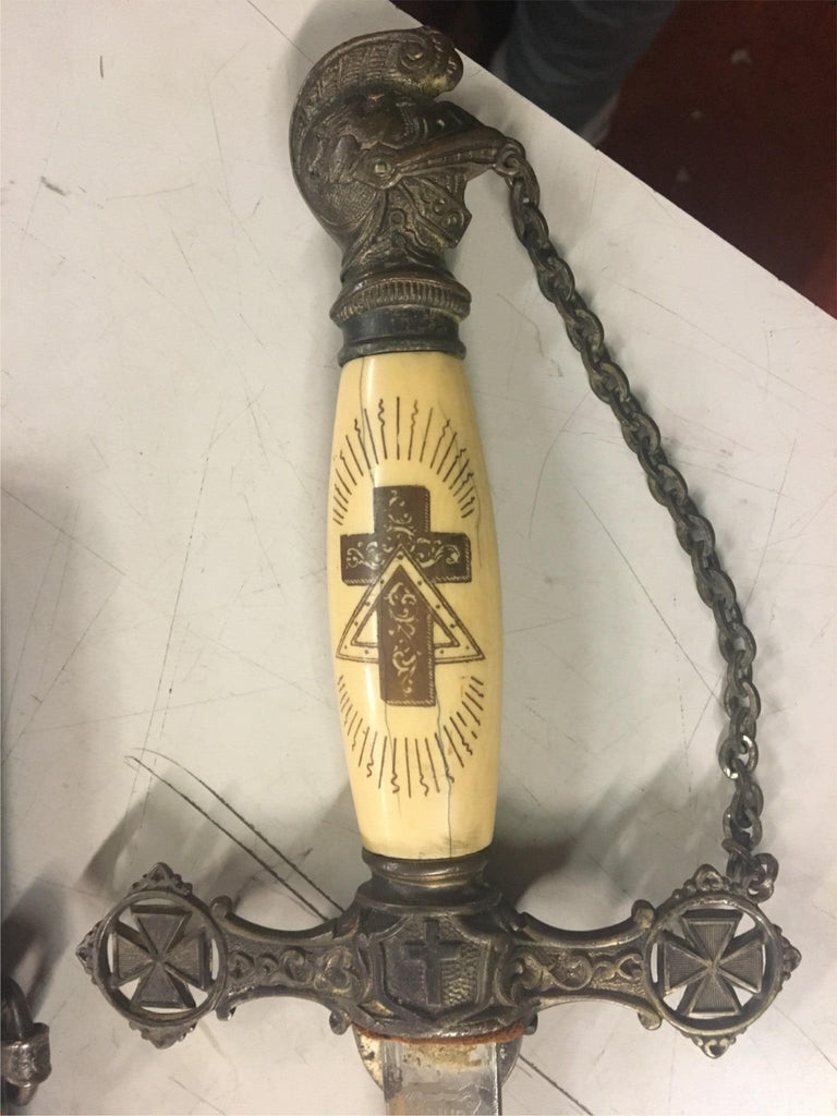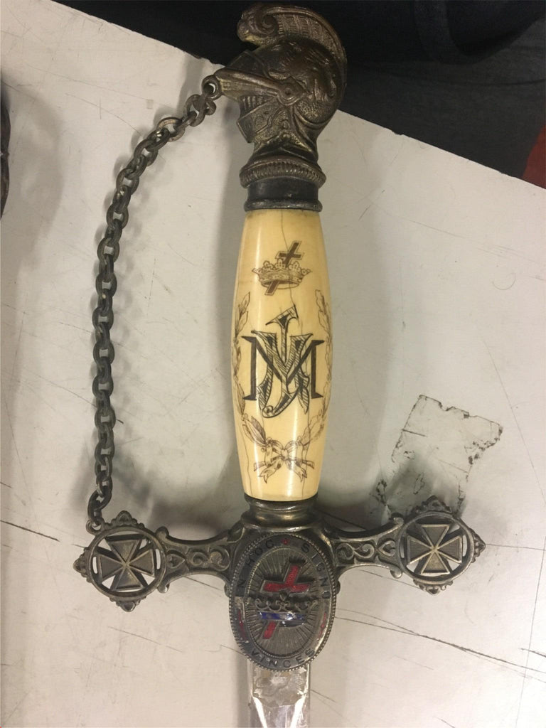 M C Lilley Co Templar Etched Sword bone Masonic Knights w Scabbard chain & loops