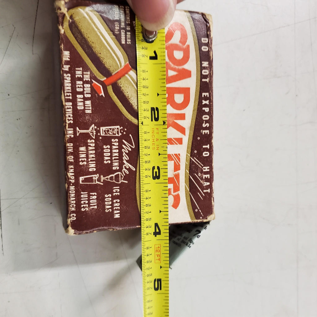 This is a box of 10 vintage Sparklets carbon dioxide cylinders is new, and unopened. The box measures 3 3/4" x 2 5/8" x 1 1/2" and contains 10 cylinders.