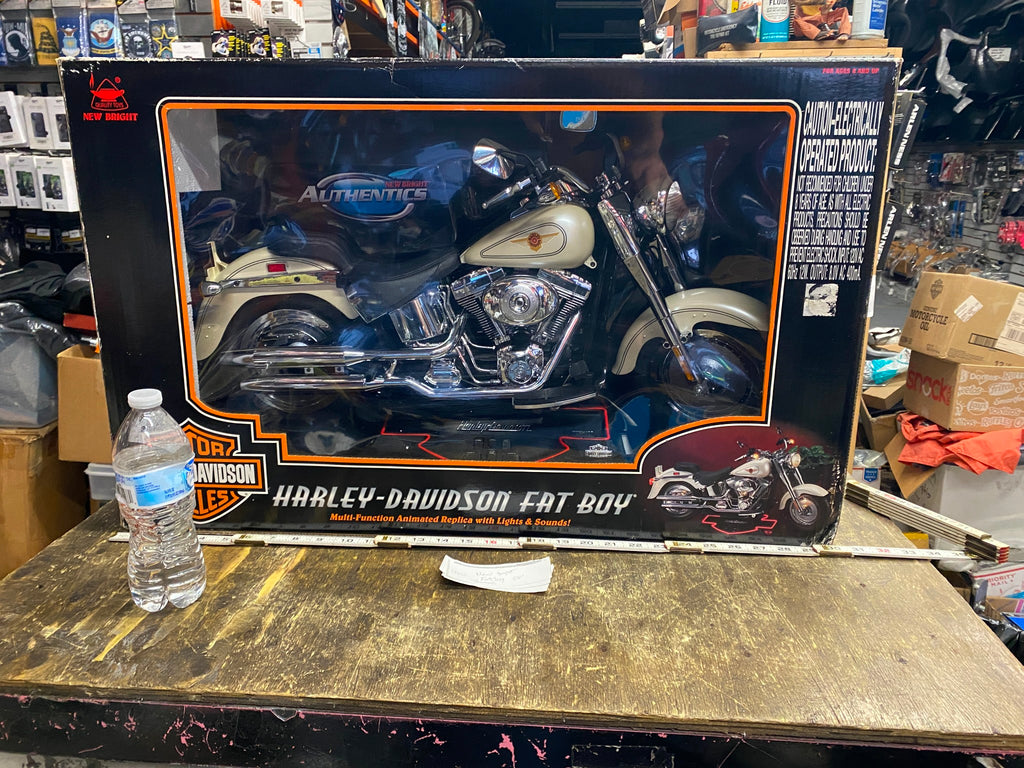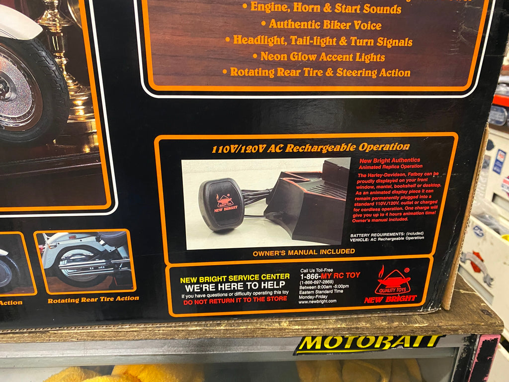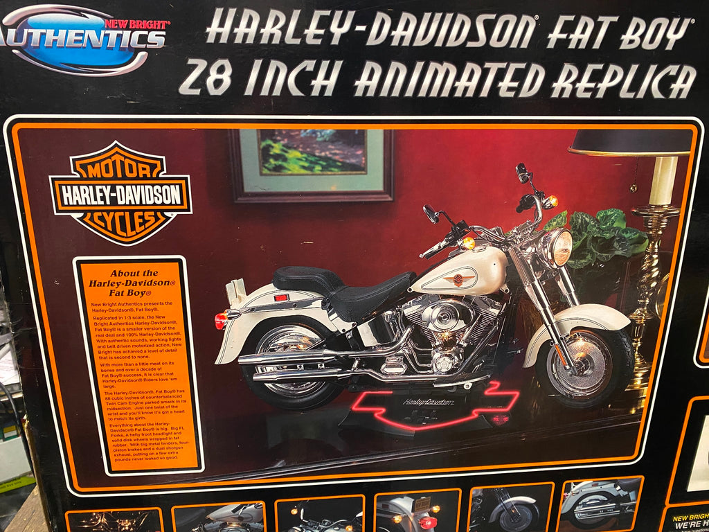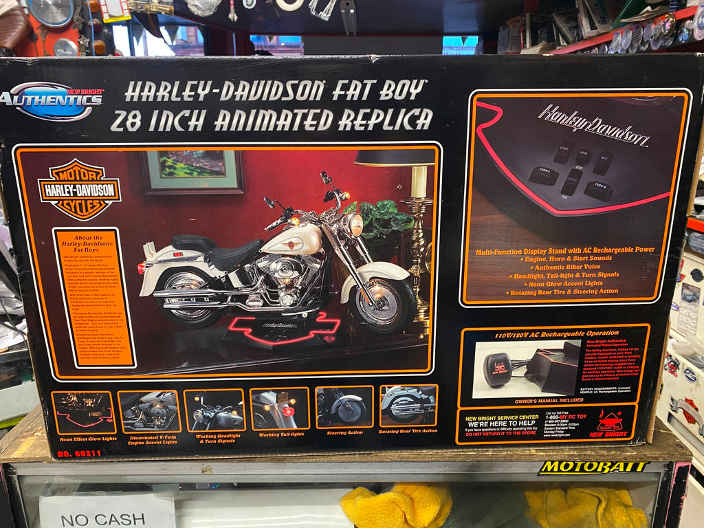 NIB 28" New Bright Authentic Harley Fatboy Automated Replica Sound Lights Display stand built in, box has never been opened bought in early 2000's alot of details right on box.This is not the rc one!