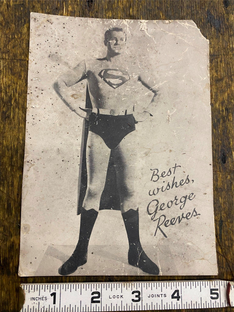 vintage photograph featuring actor George Reeves in his role as Superman from the television series Adventures of Superman (1952-1958). The image includes a printed signature that reads "Best wishes, George Reeves".