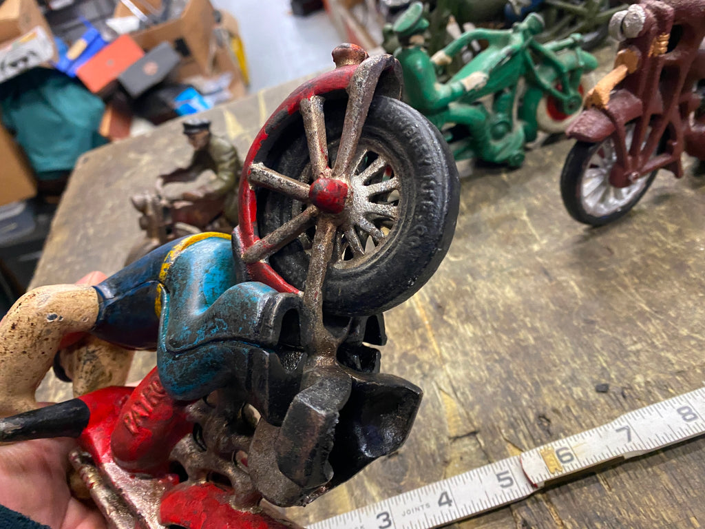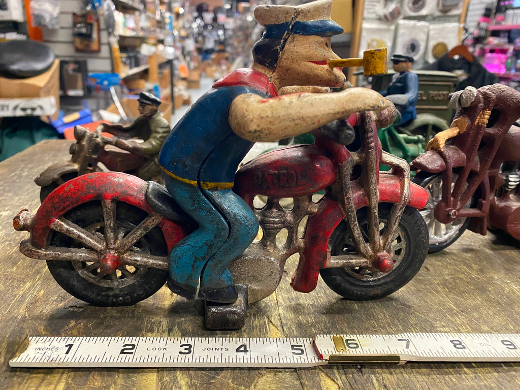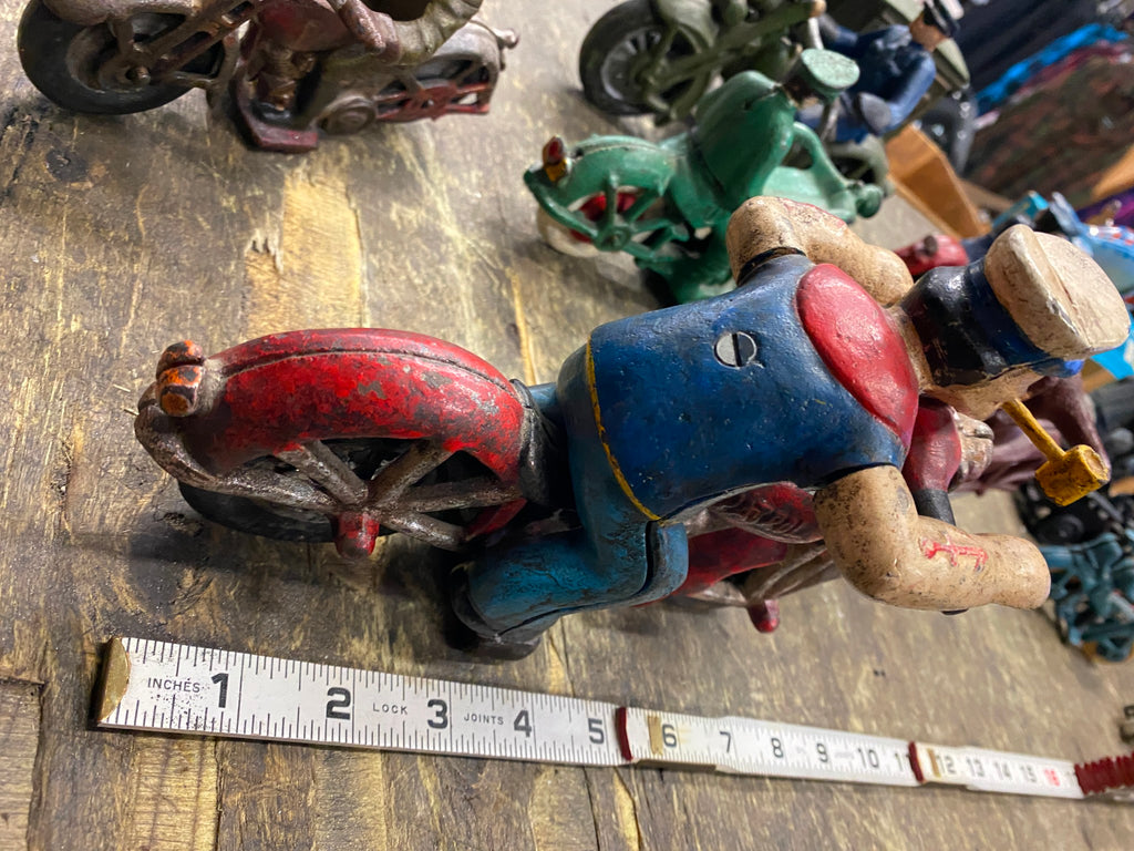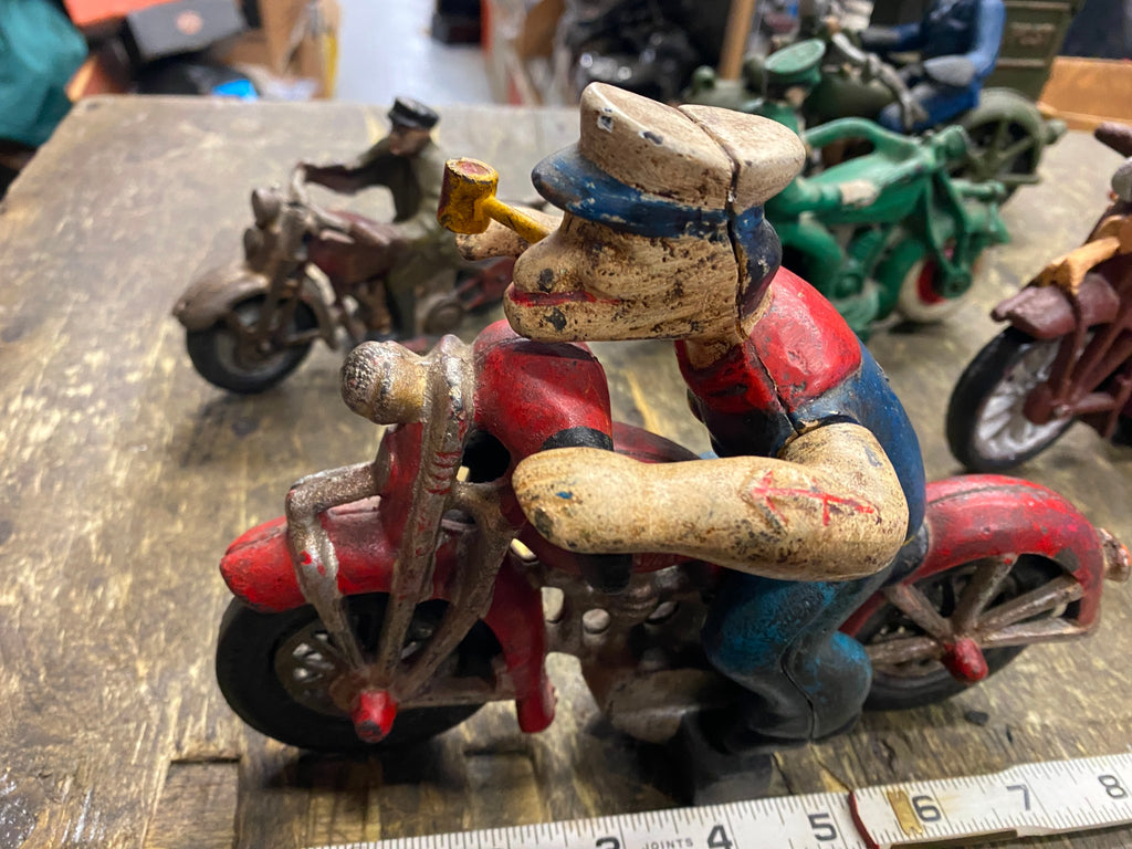 Popeye Sailor man Harley Patrol Motorcycle Police Cast Iron Toy Figurine Hubley believe its a repop, hubley or repop selling off a bunch of cast iron motorcycle toys from an estate! some nice stuff!!
