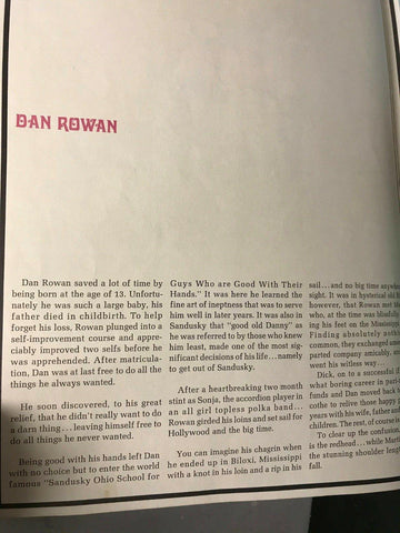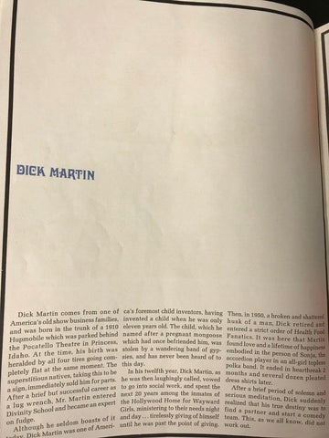 I DO NOT KNOW WHAT THIS BOOKLET IS FROM.  IT HAS PHOTOS OF DAN ROWAN AND DICK MARTIN AMONG OTHER FAMOUS PEOPLE FROM THEIR SHOW AND LAUGH IN.  IT BOOK IS 9 3/4" X 13".  THE FRONT LOOKS LIKE IT COULD BE 3D .