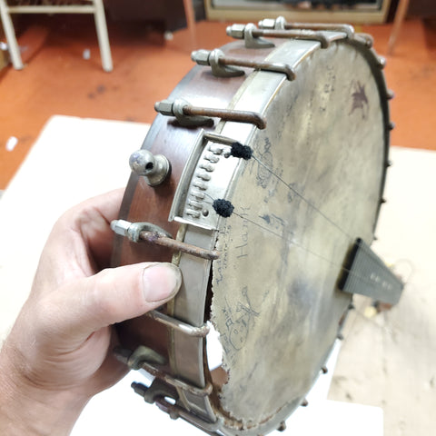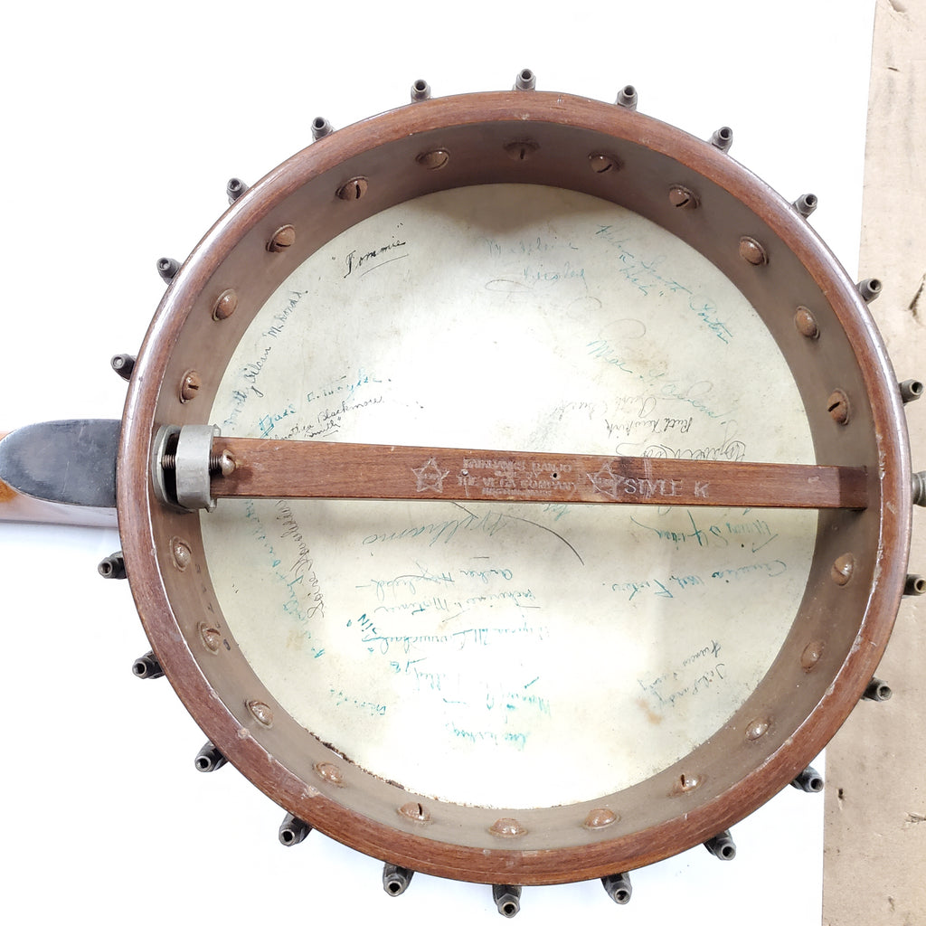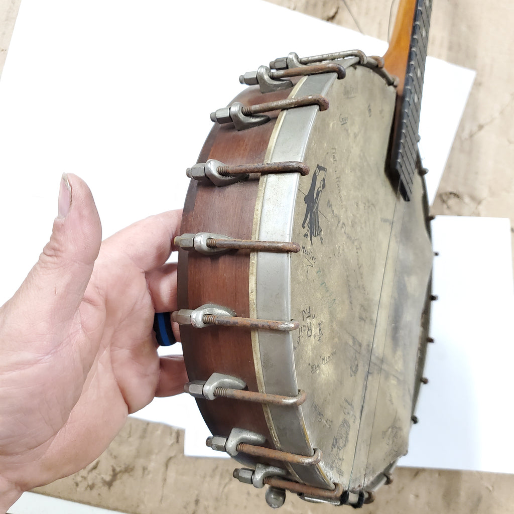 Vintage Banjo ,Mandolin , Banjolin Vega Autographed Musicians Antique W case! It came from an estate, guessing 1920's . Back wood piece is marked Vega doesn't seem to fit banjo, not sure how they worked. Tried looking up a couple of the names, typed them in with name & musician, couple of them showed up. Would be a great wall hanger . Maybe someone famous on there.