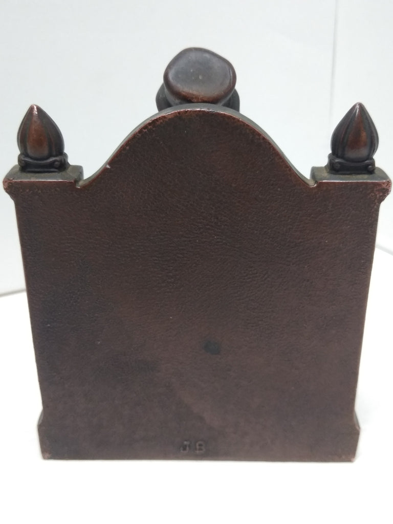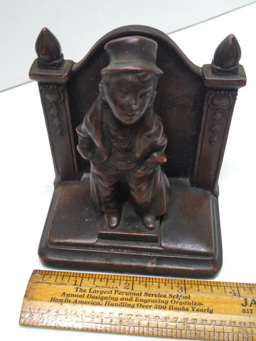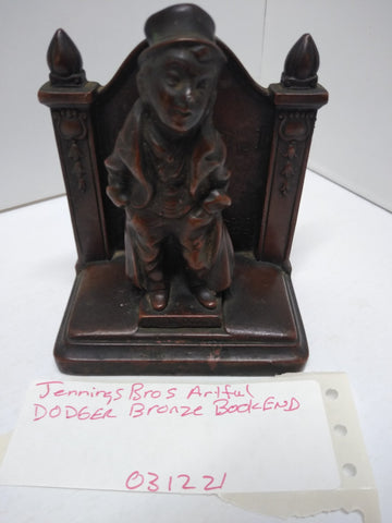For your consideration is this Recent Vintage Estate Find! This is a Bronze or Bronze Plated rendition of the Artful Dodger Character from the famed Charles Dickens novel Oliver Twist! Jennings Bros was the maker of this lone Bookend. I find it to be worthy as a stand alone sculpture considering it's iconic subject matter. It is a wonderful piece and would be great as a single bookend, paper weight, or just as it is as décor. The bottom plate is loose and included although not pictured, and there is a crack in the base behind his feet, but it wasn't obvious so I almost overlooked it at first, I tried to get a picture of it for your inspection. Pictures are taken with flash and without. I did not clean this Bronze piece and am leaving it up to you. This lot is being sold as is and as pictured. Please look at all the pictures carefully and ask any questions before making your purchase. Save on shipping by coming to store in Butler Pa 031221