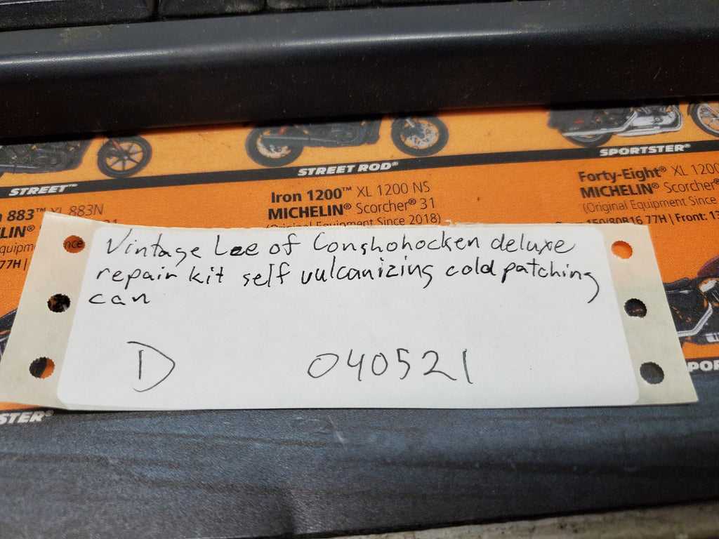 Vintage Lee of Conshohocken deluxe repair kit self vulcanizing cold patching can. This item is in nice condition. This would look awesome with the rest of your memorabilia.