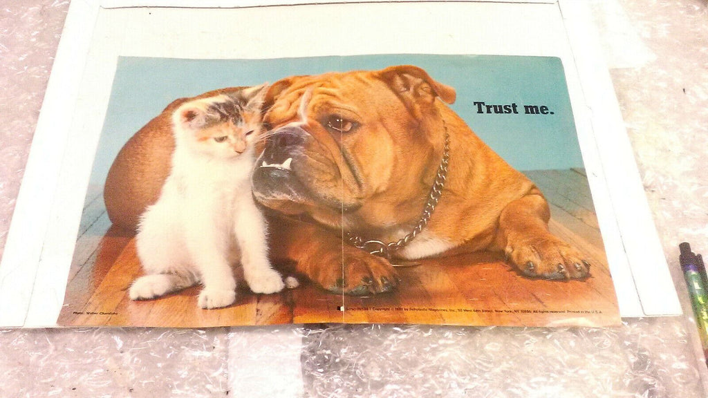 Vintage Scholastic posters. B.J. and The Bear, WKRP in Cincinnati, and a Bull Dog and Kitten poster that reads 'Trust me'. B.J. and The Bear Poster in great shape, no big tears or rips. WKRP poster in fair shape, some tears along fold lines. Dog and Cat poster in great shape with no rips or tears. All three from around 1980-1981.