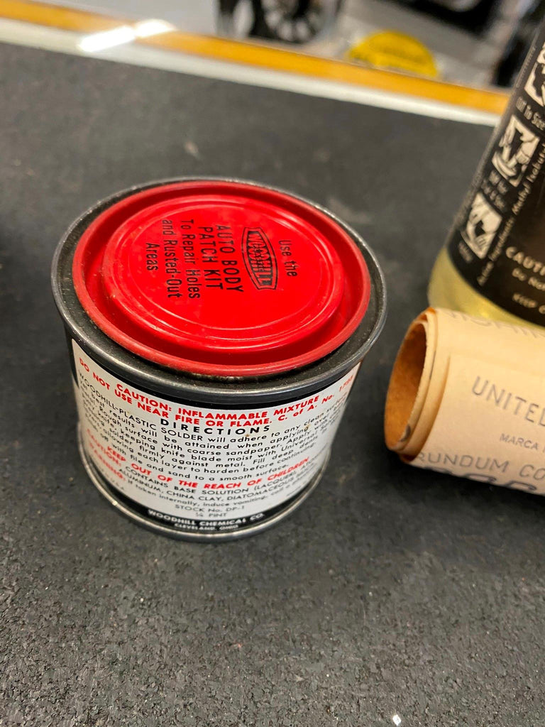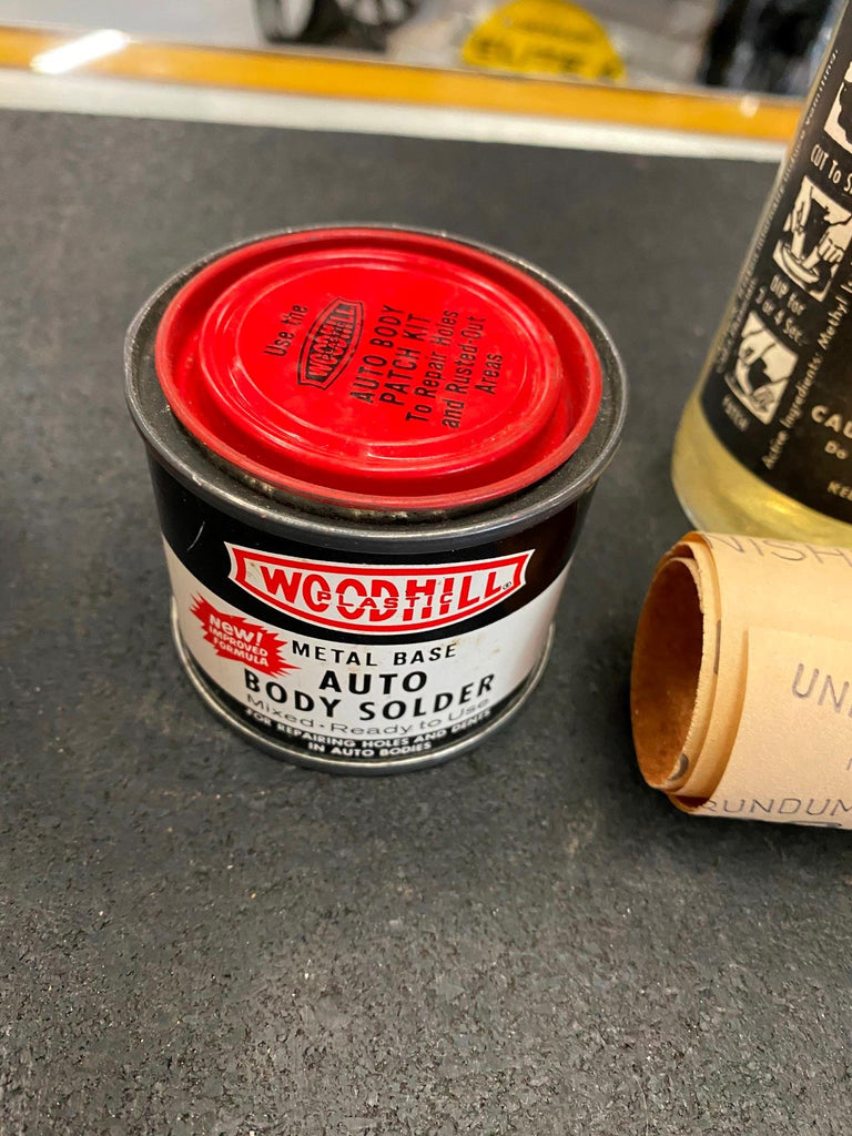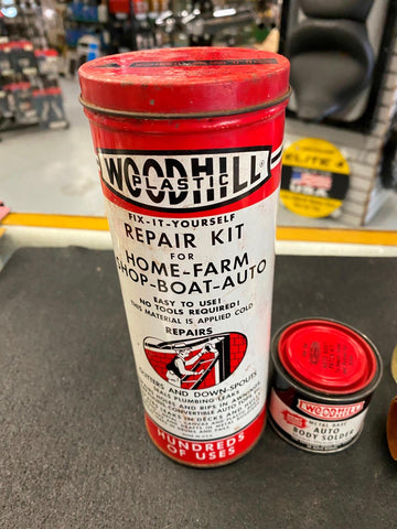 Vintage Woodhill auto Body Repair Kit Tin Can bottle Graphix 1940's Oil Gas Petroliana.... great looking set, still has the price tag of 1.49 on side..... comes with both cans, (sandpaper made in usa) know thats old.... and glass bottle.... great piece for the collector!!