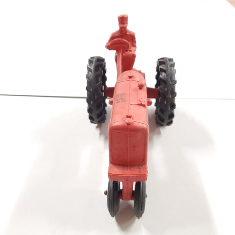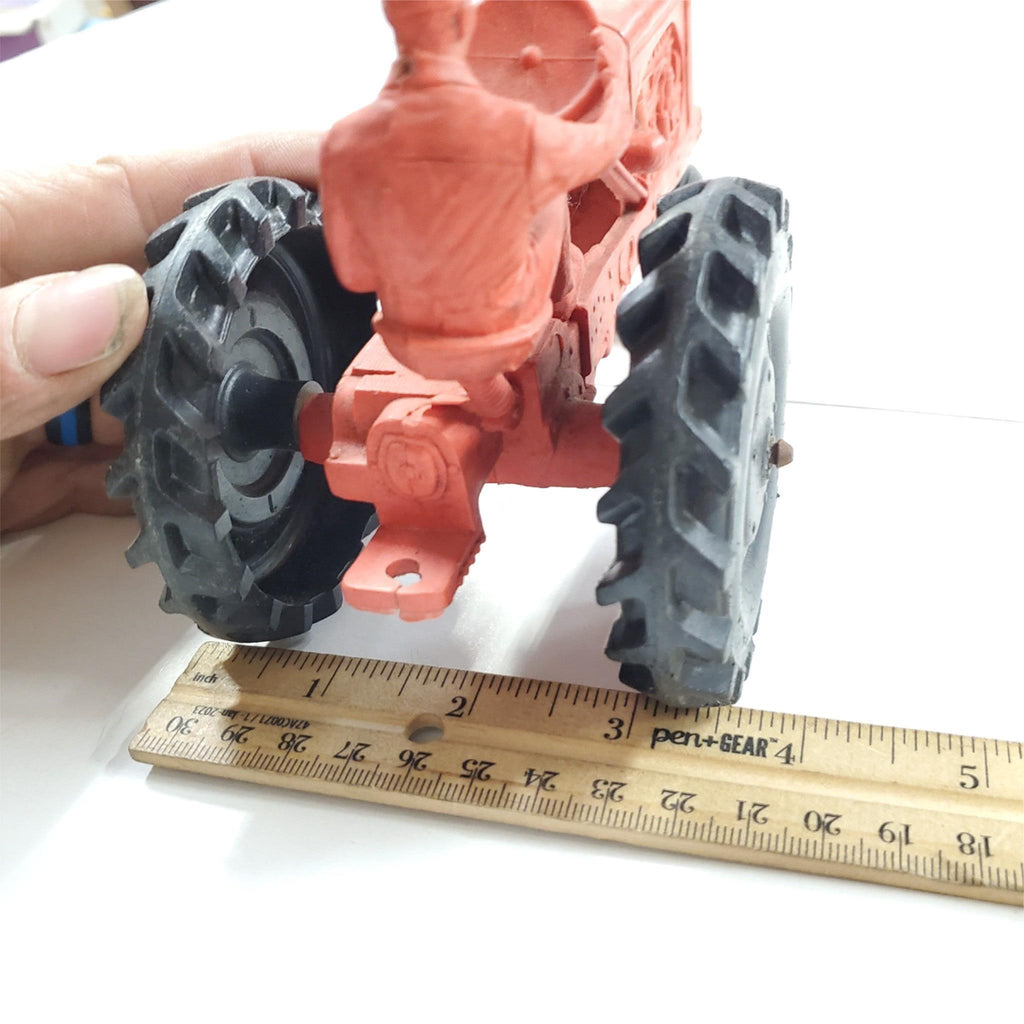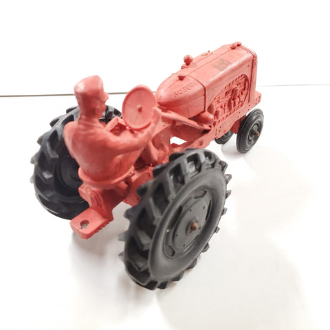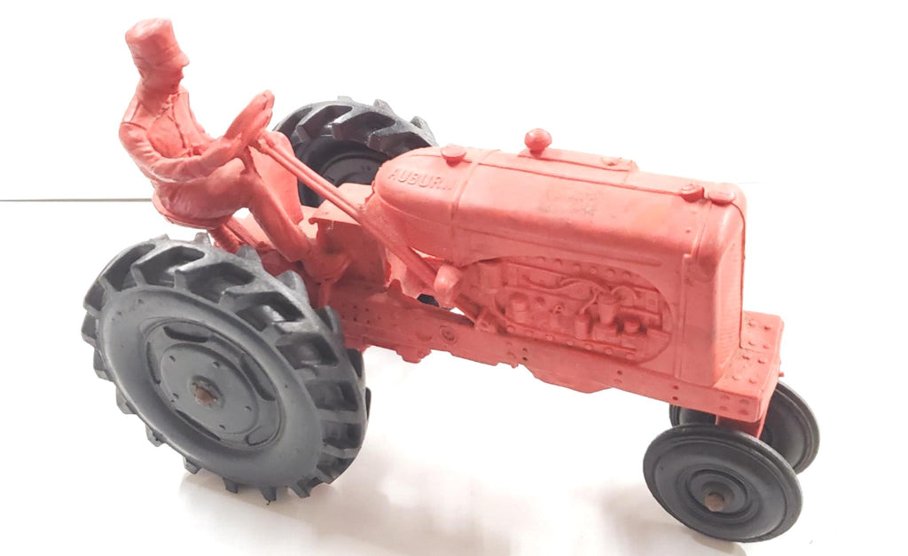 This item is a vintage Auburn Rubber Company toy tractor with a driver figure, specifically the Model #572. These toys were primarily manufactured in the United States during the 1950s and were modeled after popular farm equipment, such as the Allis-Chalmers WD45 tractor.