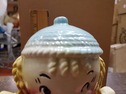 Vtg 1950S American Bisque Yarn Girl Doll Cookie Jar Yellow Pink & Blue Collectib