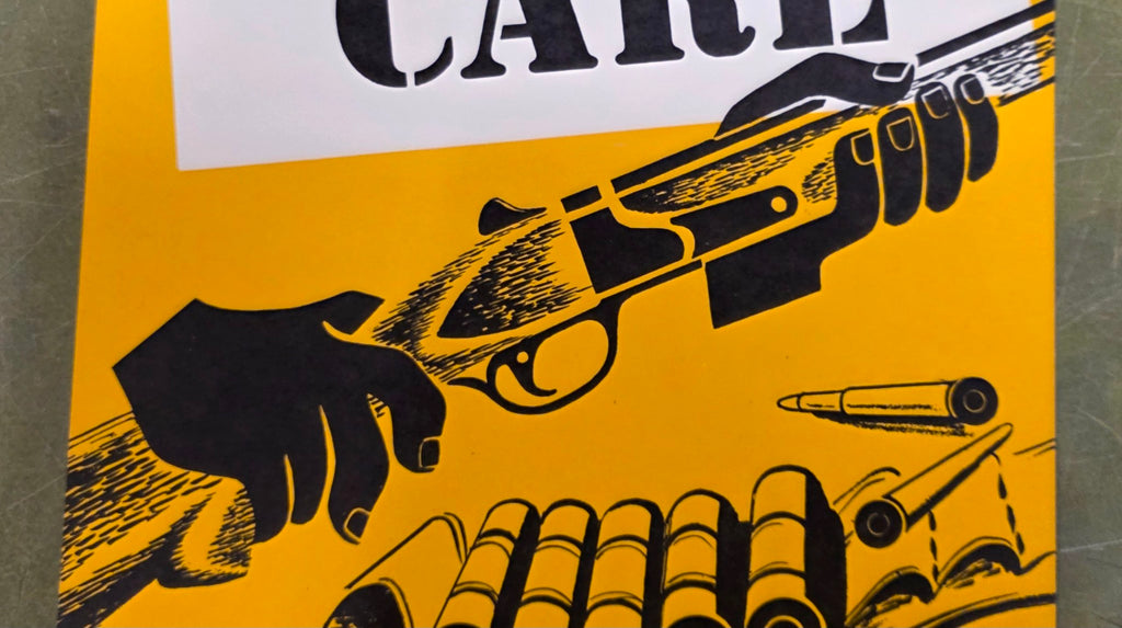 This vintage poster focuses on firearms safety, specifically highlighting the importance of handling ammunition correctly and not mixing rifle and shotgun ammunition.