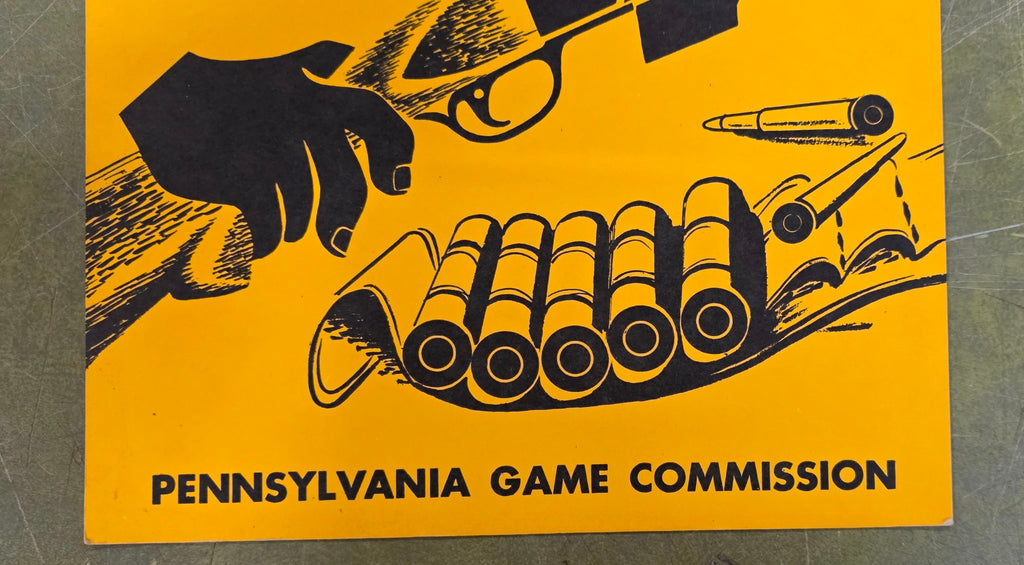 The artwork and message served as a public service announcement for hunters in Pennsylvania during that era, emphasizing responsible and safe hunting practices.