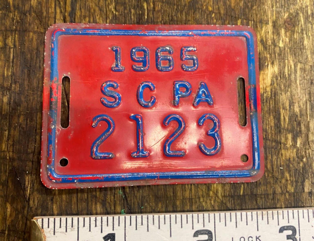 The plate is red with blue embossed text and numbers, including "1965", "S C PA", and "2123".