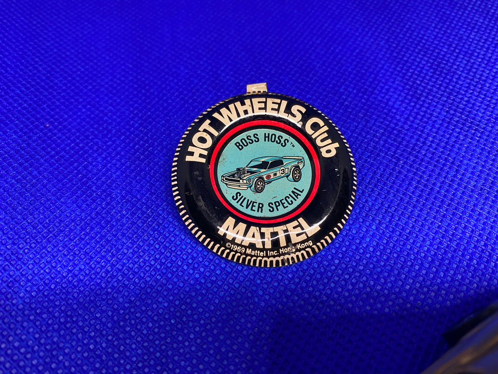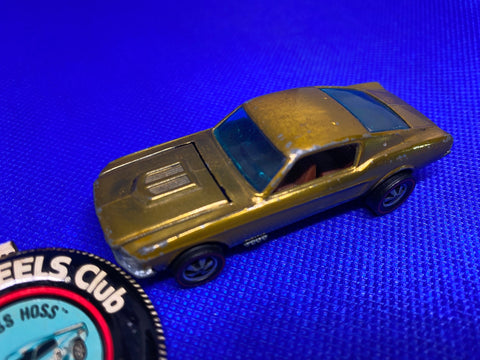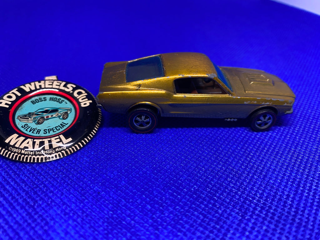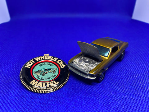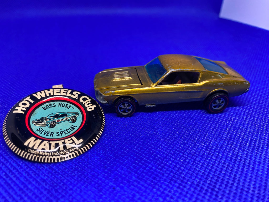 vintage Hot Wheels 1968 Custom Mustang in a gold color, accompanied by its original "Boss Hoss Silver Special" collector's button.