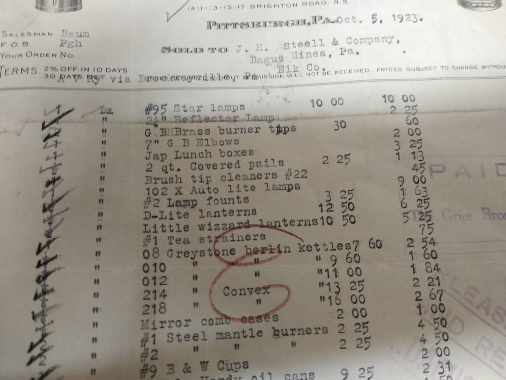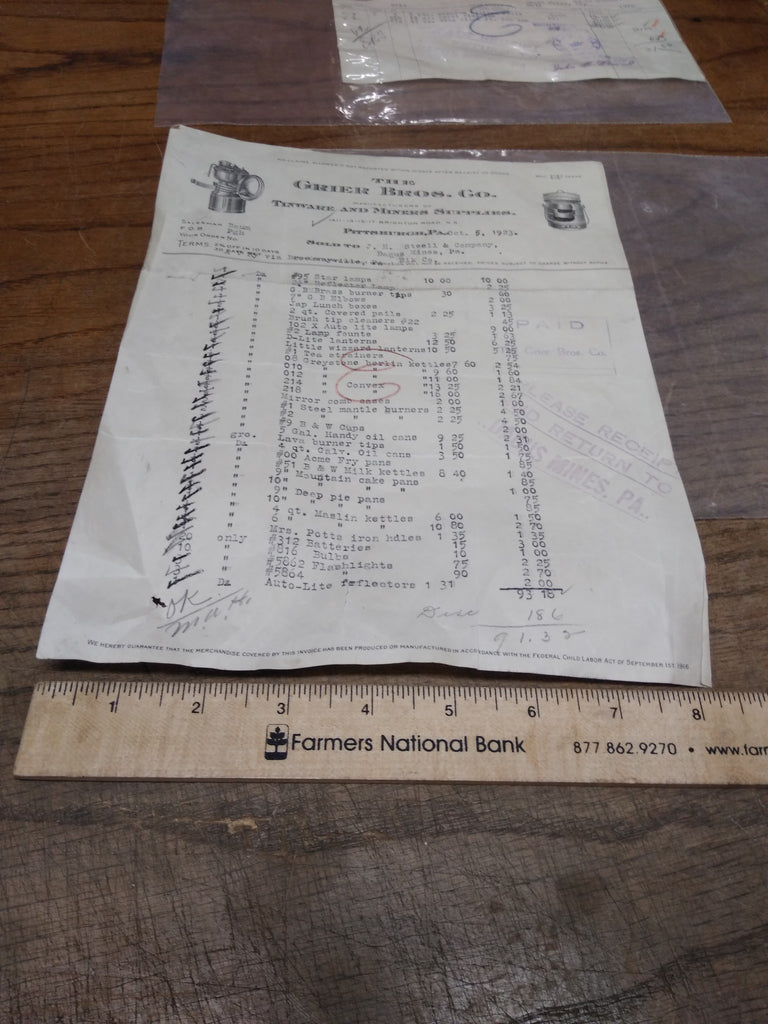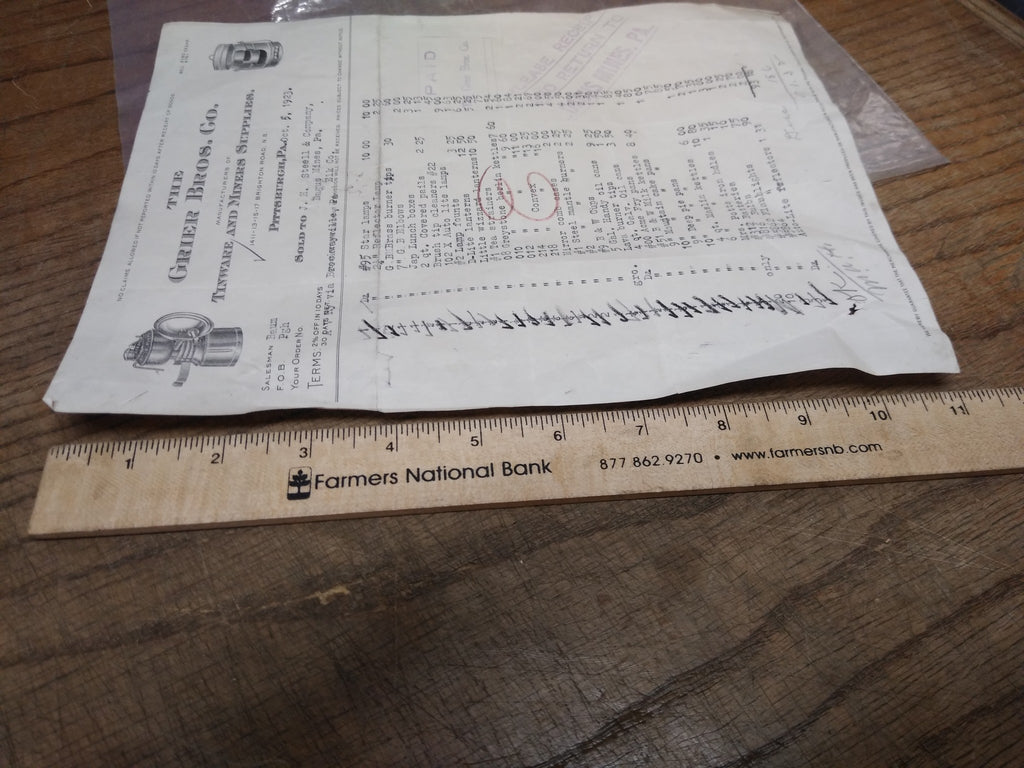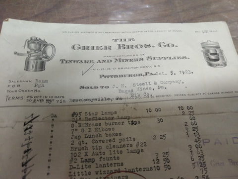 Vtg 1923 Antique Bill Receipt Grier Bros Co Tinware Miners Supplies Pittsburgh