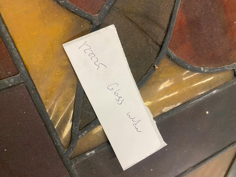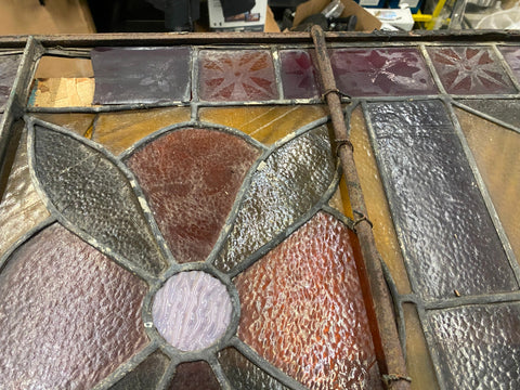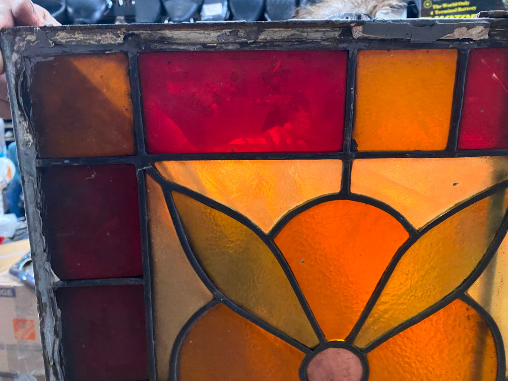 vintage-style stained glass panel featuring a central floral motif.