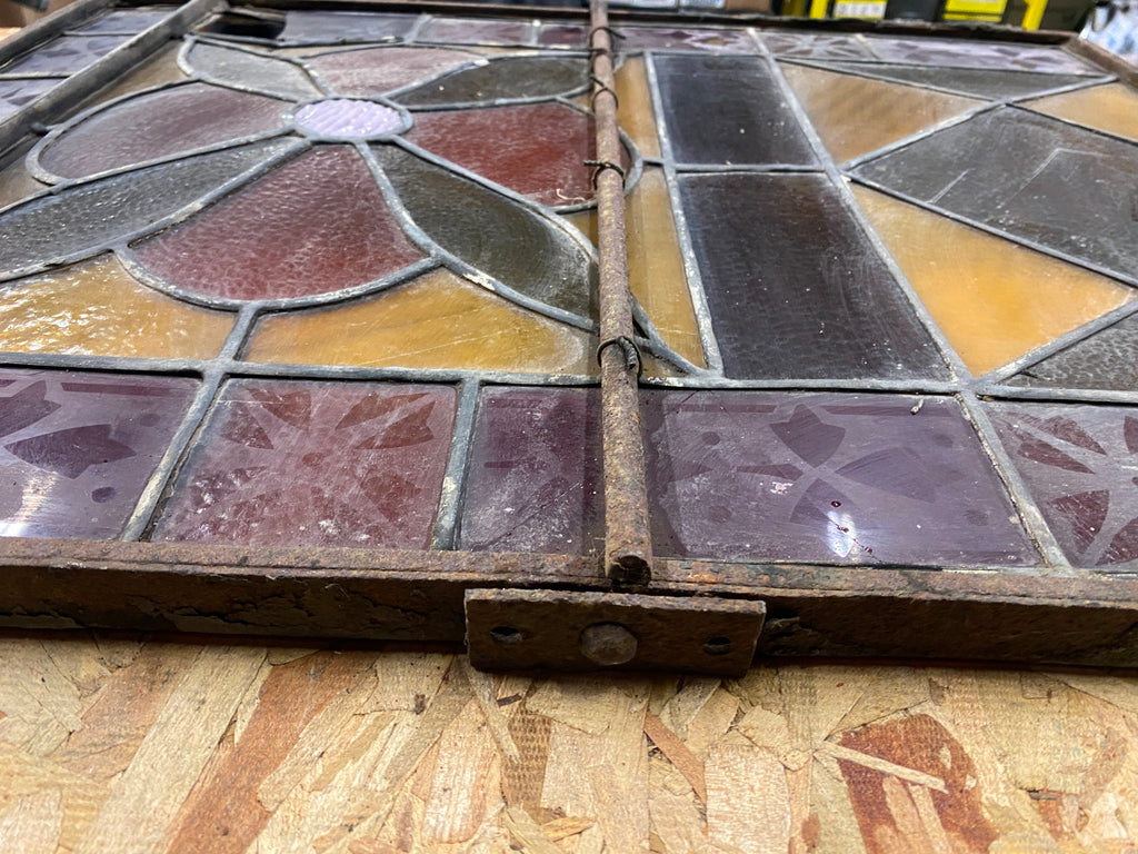 Vtg Antique stained glass Window 1900's floral motif Iron Frame Lead quatrefoil