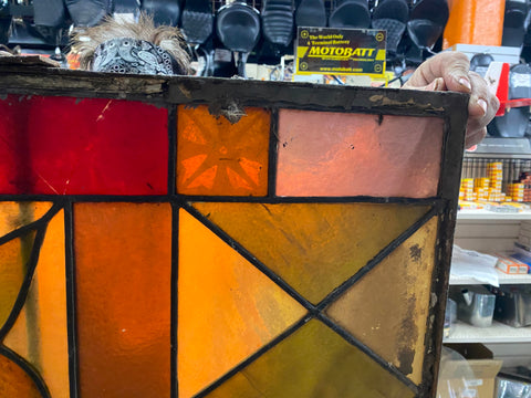 The panel is constructed with various colors of textured glass, including amber, red, orange, and green hues.