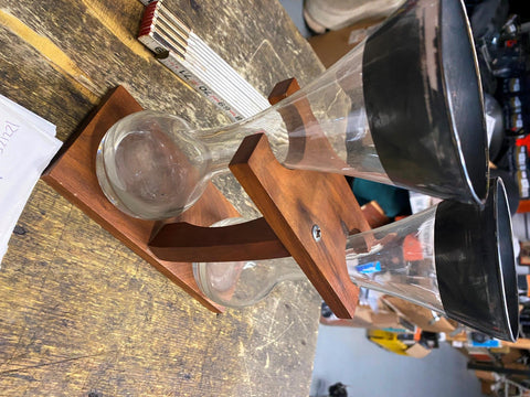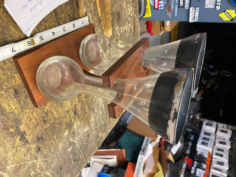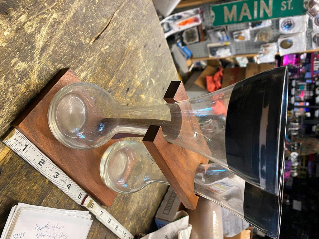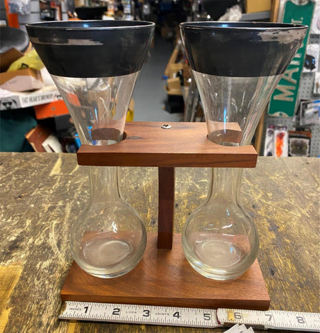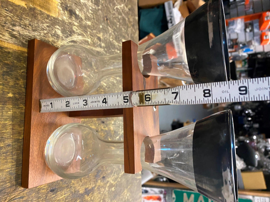 Vtg Double Beer Stemmed Glasses Yard walnut Dorothy Thorpe Barware Mid Modern not certain of brand but thorpe style great set for the home bar!! Silver rim glasses!