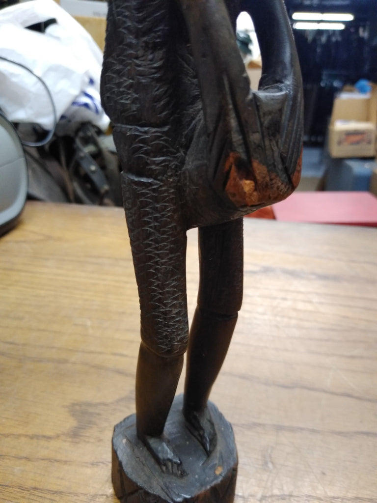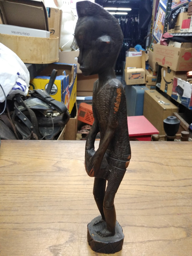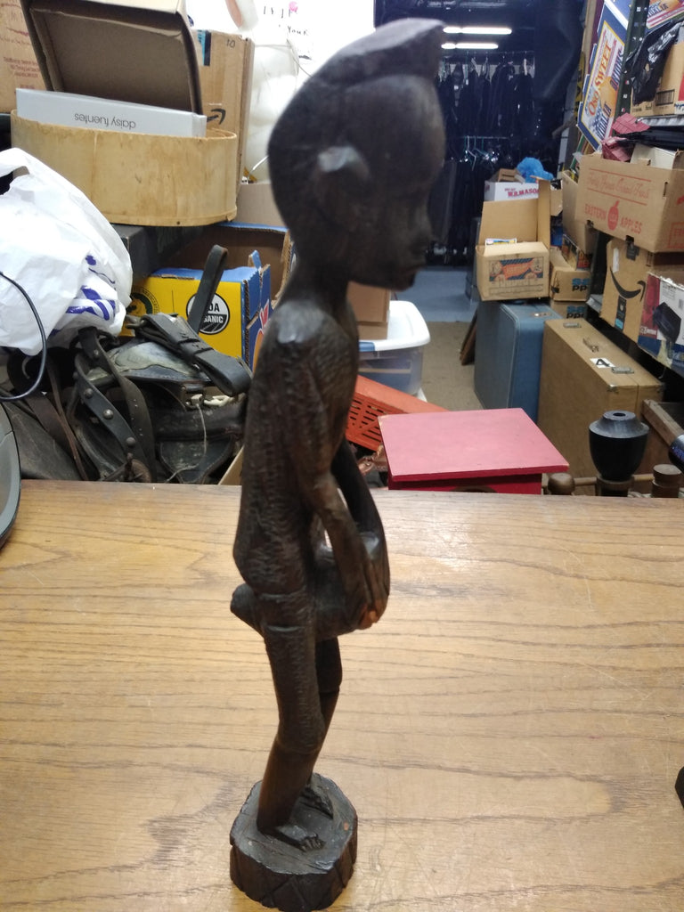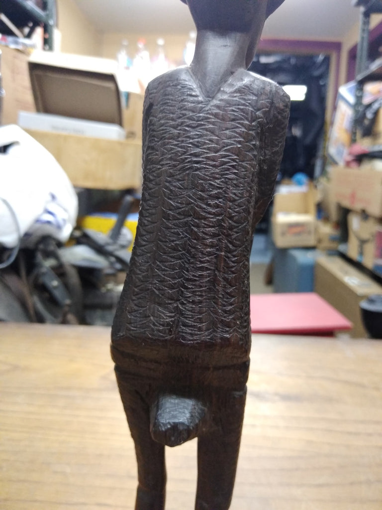 This is a Vtg. Ebony Wood Hand Carved African Tribal Man Figure, it is 12" Tall and a very skillfully carved Sculpture! The pictures are a substantial part of the description so please examine all the photos and contact me if you have any questions. We will be happy to save you shipping costs by picking this up at our shop. Thanks for looking   102321-RK-06