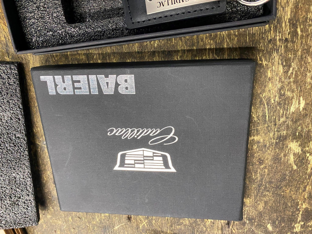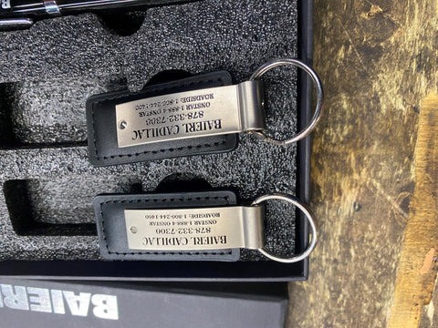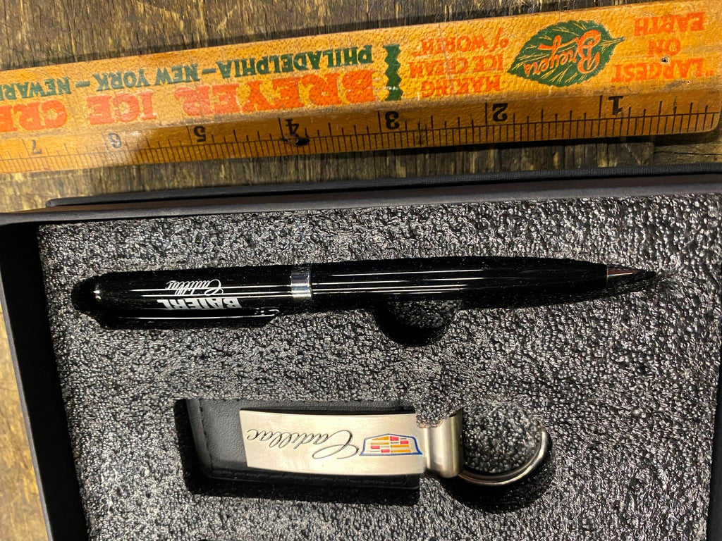 Vtg Key Chain fobs Pen Set Boxed Cadillac Dealer Promo Advertising Auto Gas Oil from baierl Cadillac not sure of era pen worked fine Nice looking set! Great for a display!!