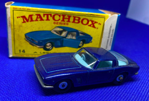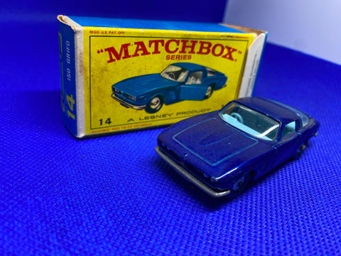 vintage Lesney Matchbox Series No. 14 Iso Grifo die-cast model car in metallic blue with its original box.