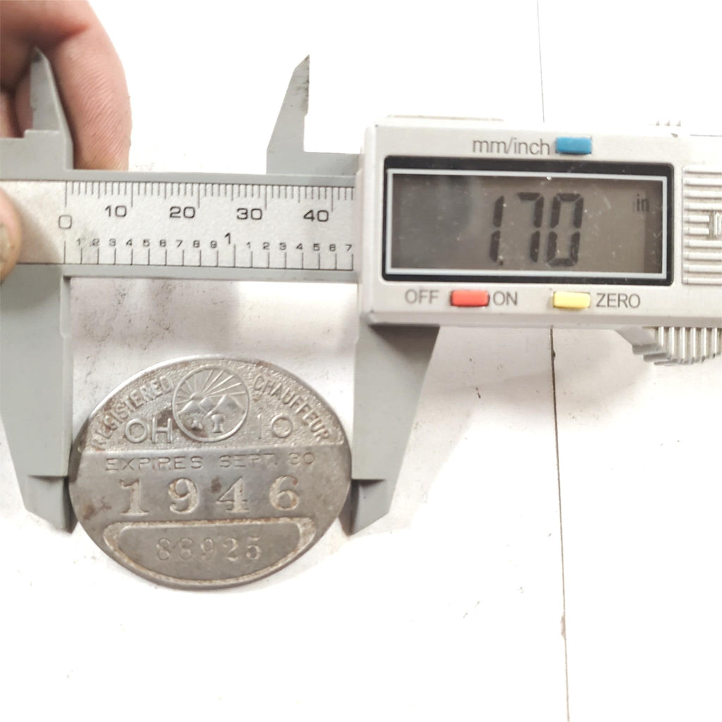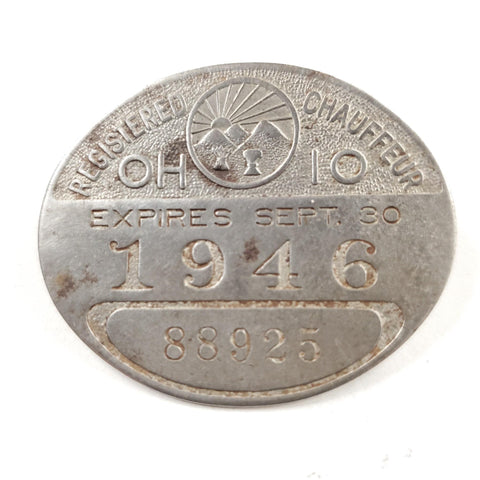 vintage 1946 Ohio Registered Chauffeur license badge. These metal pins were a form of official identification required for anyone driving passengers or freight for commercial purposes in the early to mid-20th century.