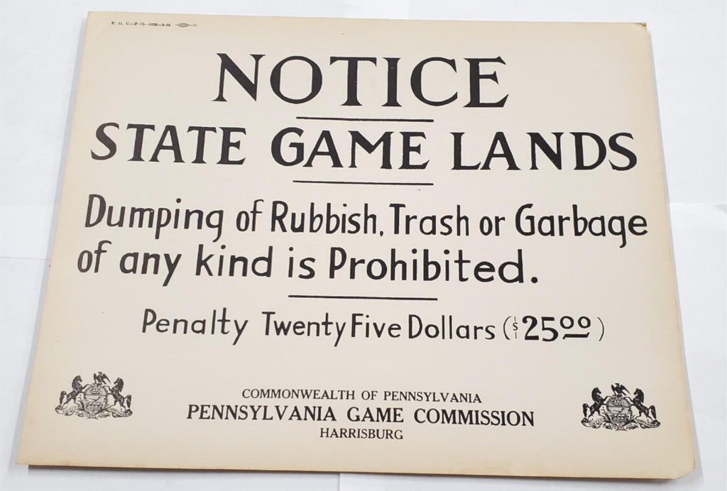 Notice State Game Lands Dumping of Rubbish, Trash, or Garbage of any kind is Prohibited Penalty Twenty Five Dollars $25.00 Pennsylvania Game Commission