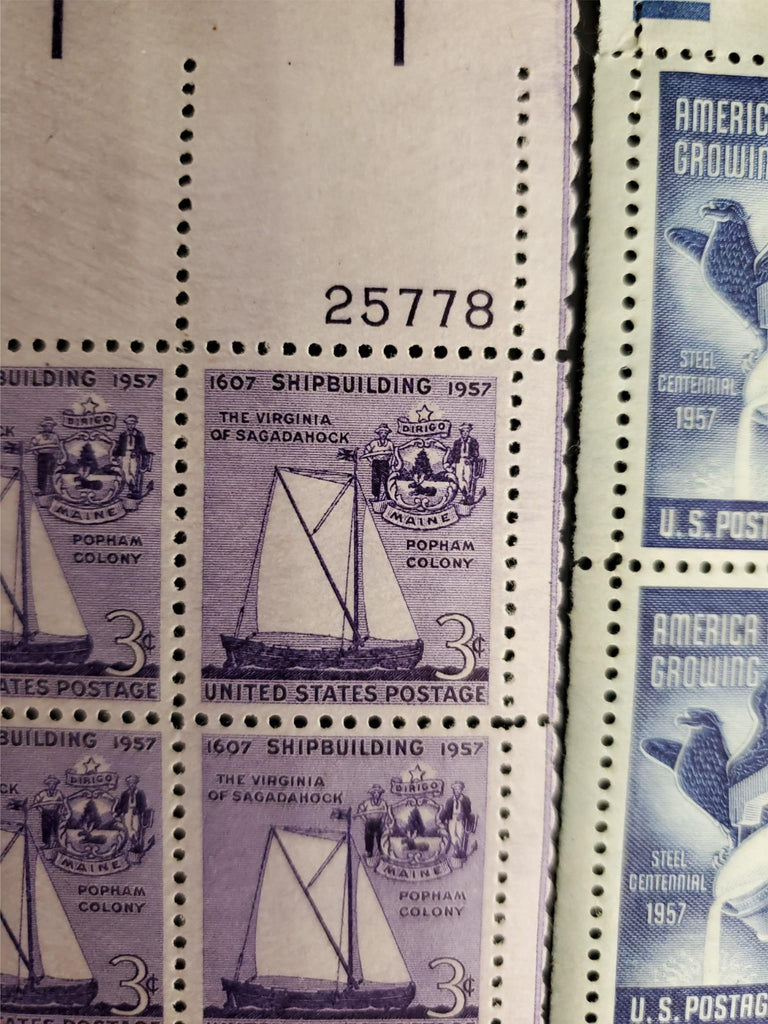 4. 1607 ShipBuilding The Virginia of Sagadahock 1957 3 Cents Sheet (70 Stamps)- Serial #25778