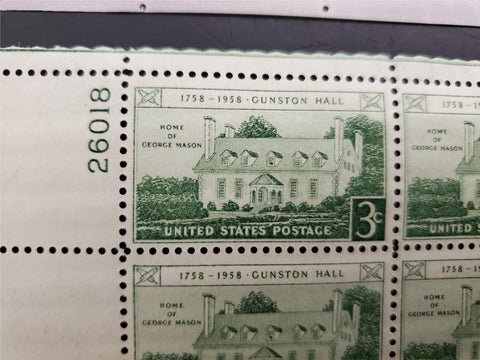 11.Home of George Mason 1758-1958 Gunston Hall 3 Cents Sheet (50 Stamps)- Serial #26018