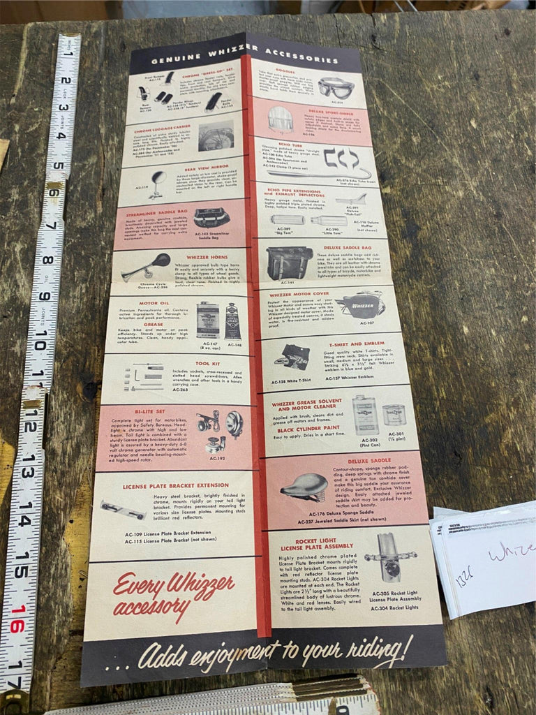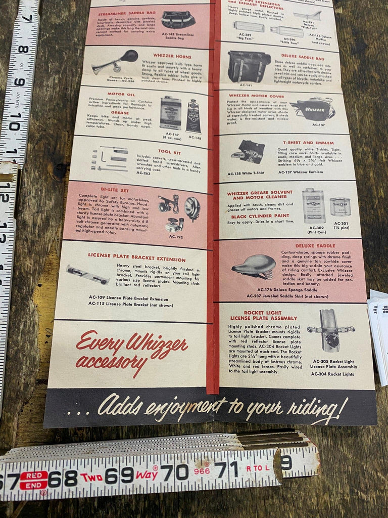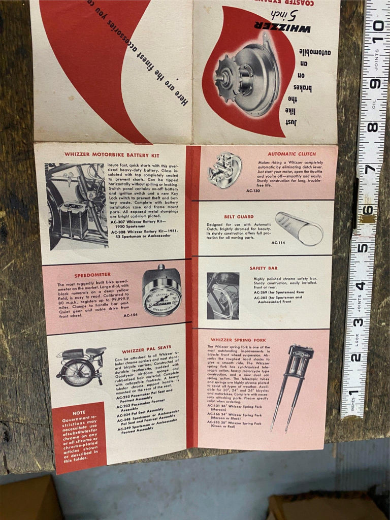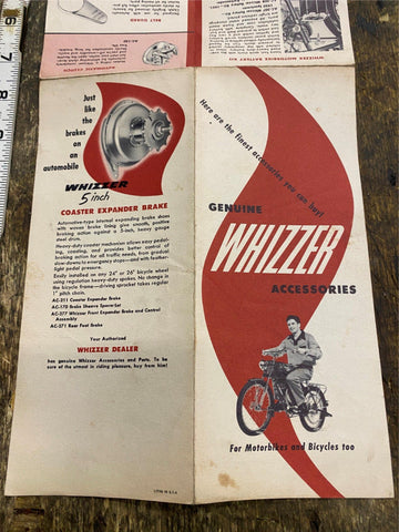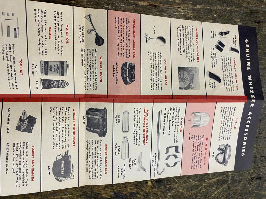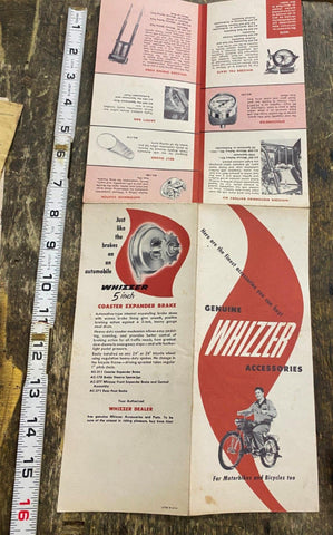 Vtg Whizzer Accessories Motorized Bicycle Catalogue Book 50's Brochure literature. Whizzer motor kits, originally introduced in 1939, allowed users to add a motor to their own bicycles.
