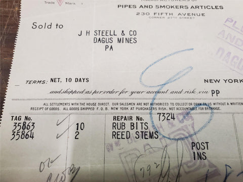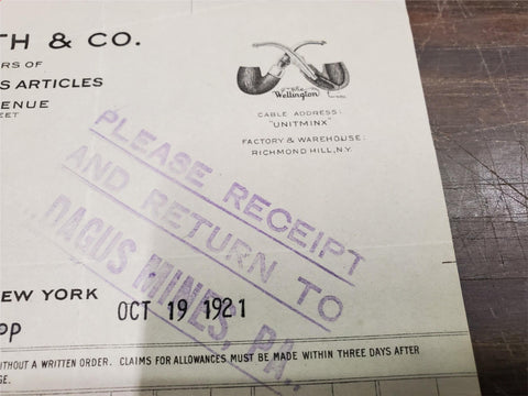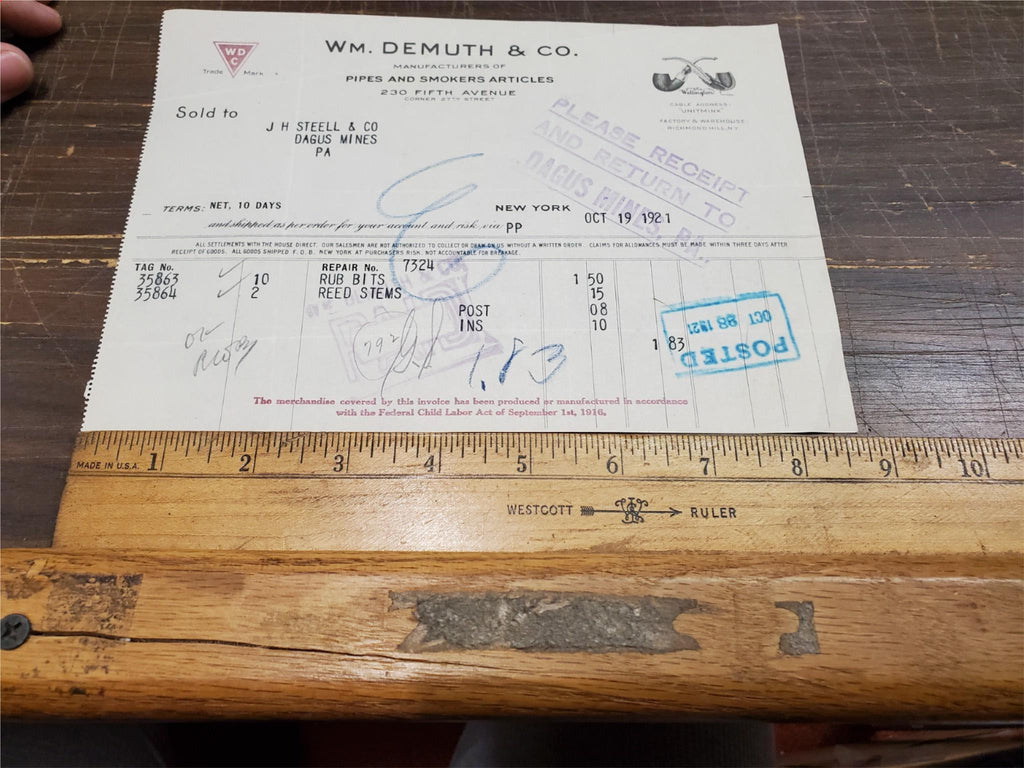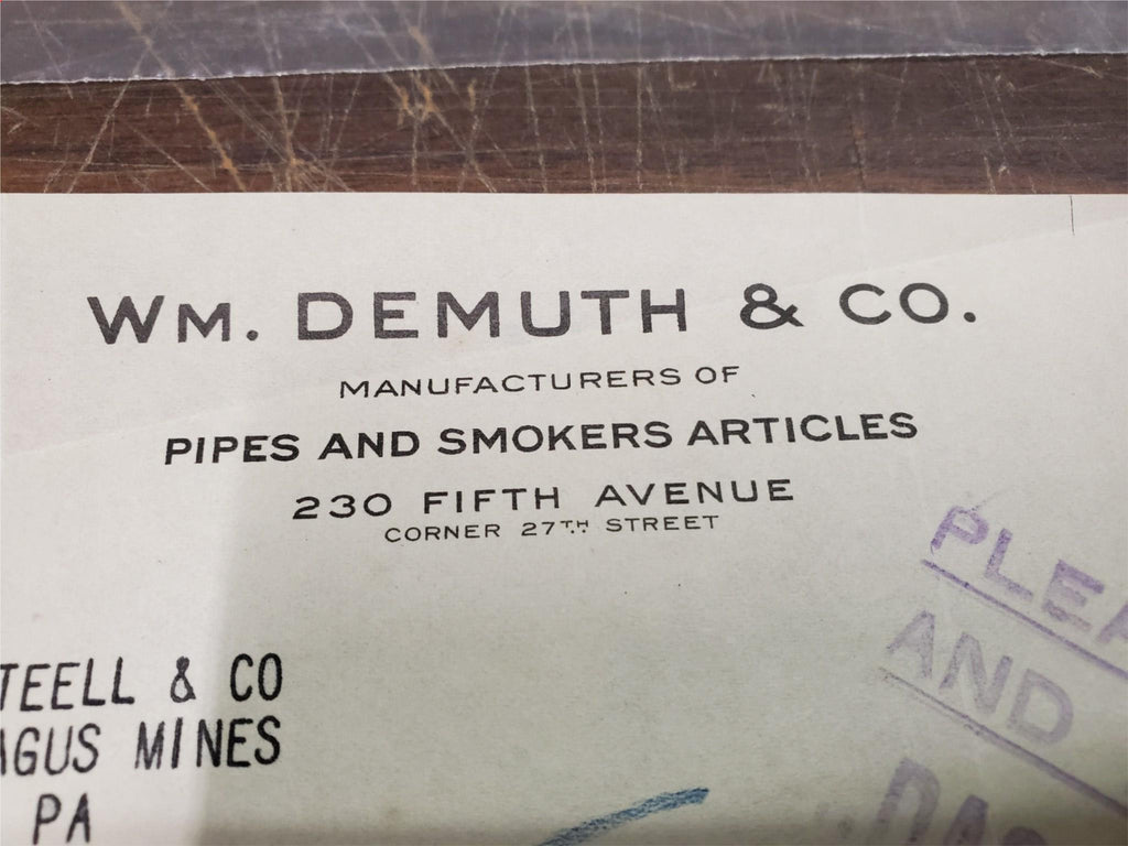 Vtg Oct 1921 WM Demuth & CO Manufacturers Of Pipes & Smokers Articles Receipt