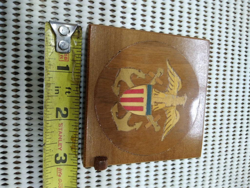 ***PLEASE LOOK AT ALL THE PICTURES AND ASK QUESTIONS BEFORE BuyING*** This is a Vintage WW2 Era United States Navy Sweetheart Wooden Marqueterie Compact Bliss Bros. This is in good condition with some signs of wear and needs cleaned.