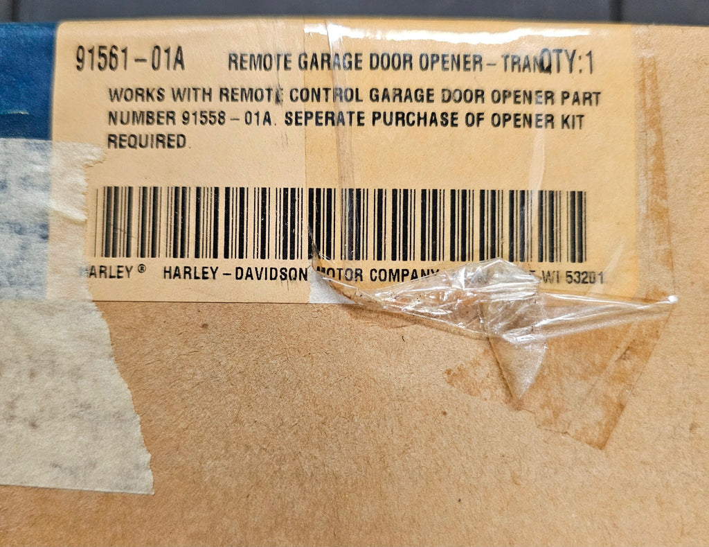 The Harley-Davidson part number 91561-01A is a Remote Control Garage Door Opener Transmitter Kit.