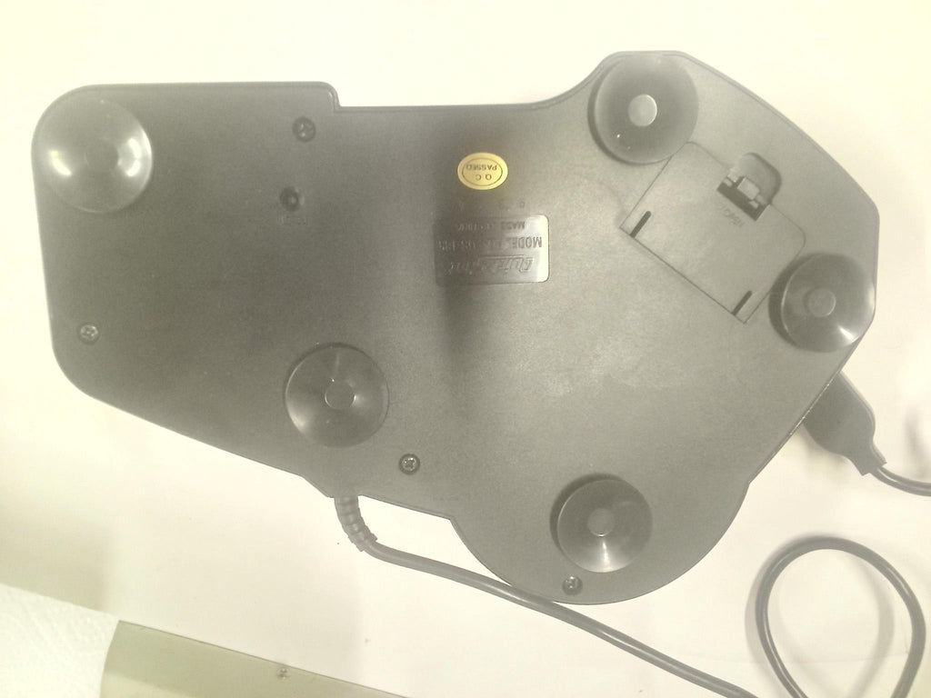 Arcade Design: Features a large, black plastic base with suction cup feet for stationary tabletop use.