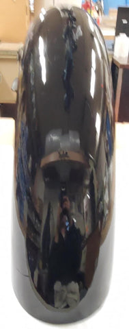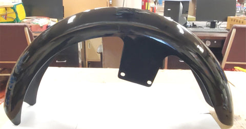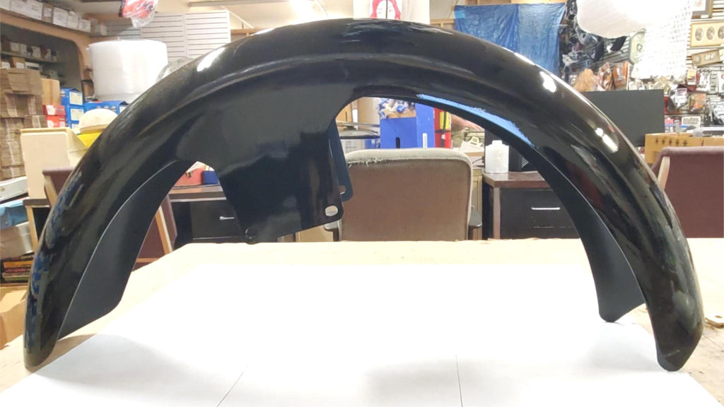 This appears to be a gloss black Vivid Black aftermarket front fender for a Harley-Davidson Touring model. These types of fenders are often compatible with various years and wheel sizes, typically from 17 to 21 inches, depending on the specific design and mounting hardware.