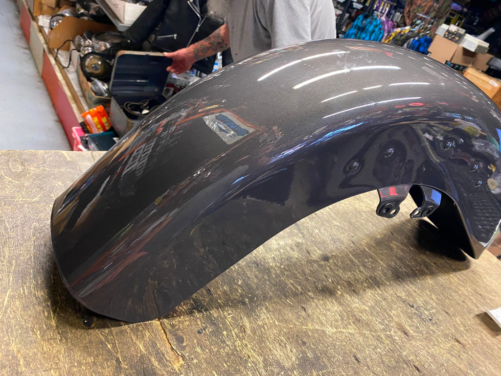 OEM Gauntlet Gray Front Fender Harley Street Road Glide FLHX FLTR Touring 2021 believe thats the name of the color compare to your application before purchasing small chip in front could use a quick buff.