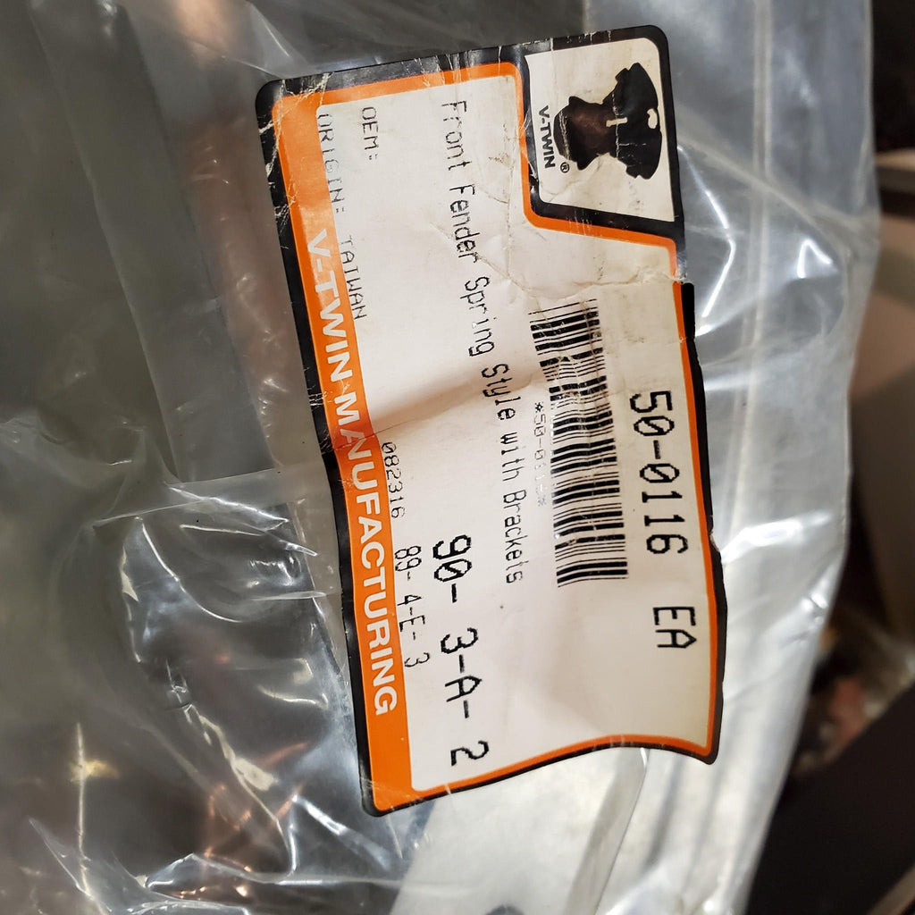 The V-Twin part number 50-0116 is a Springer Style Fender. It is designed to fit 1973-up 35 and 39 mm models with 19" or 21" wheels. This is a Universal Sport Style Front Fender that is rolled on the edge. It includes chrome braces. The brackets are not included.