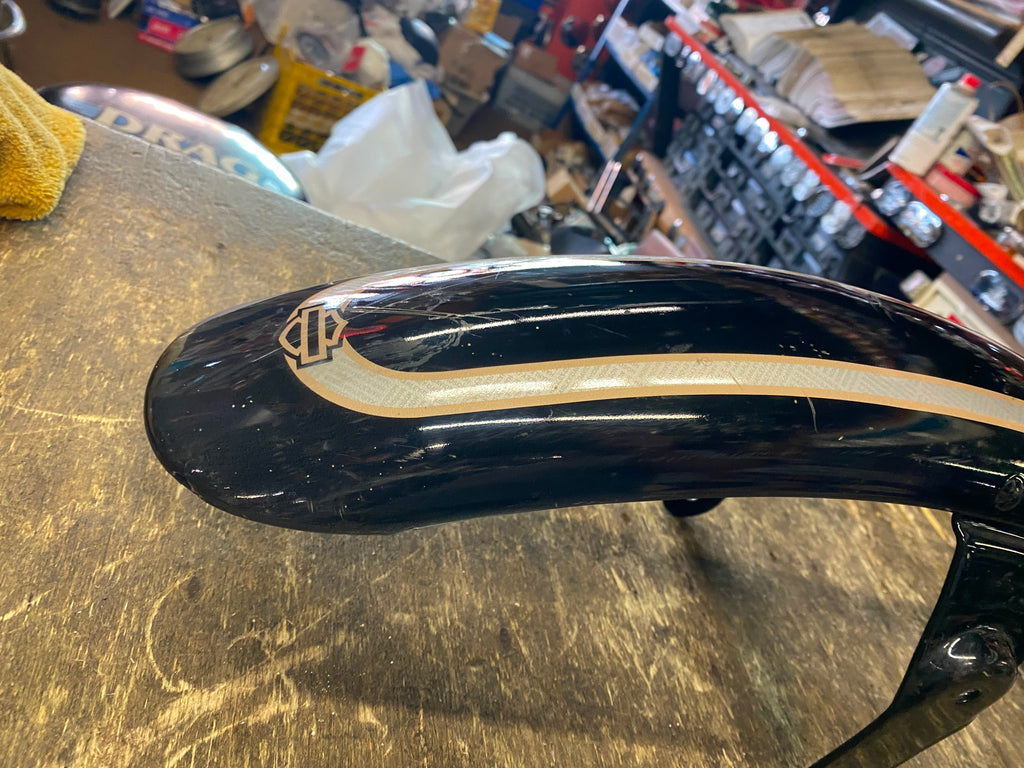 Vivid Black Front Fender OEM Harley 100th Anniversary Sportster Dyna 883 1200 little beat up maybe you can save the stripe? and repaint.