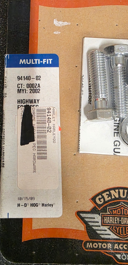 The Harley-Davidson Chrome Highway Footpeg Hardware Kit, part number 94140-02, is a multi-fit kit intended to replace the stock zinc-plated hardware on specific Harley-Davidson footpeg mounts.