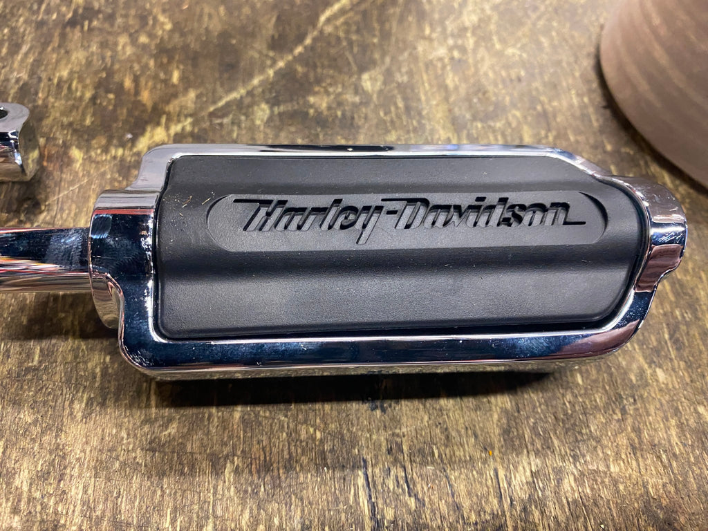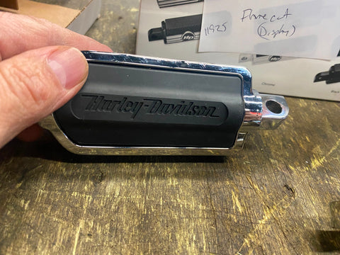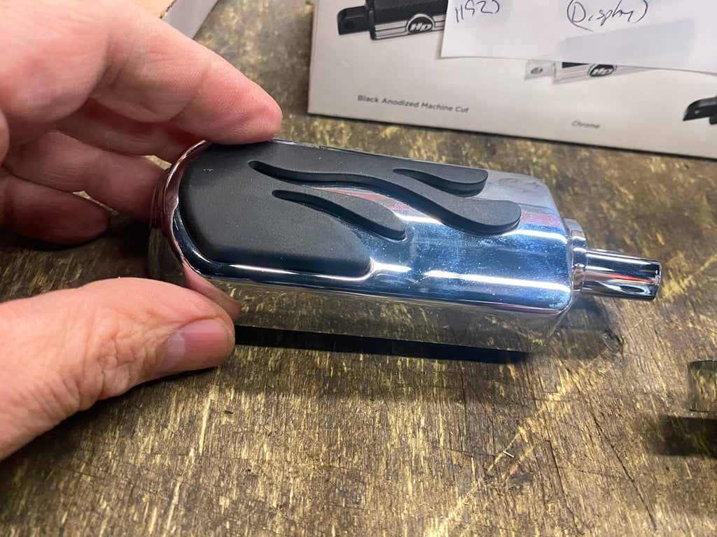 New HARLEY Flame Cut Footpegs Chrome Rubber OEM Softail Dyna Sportster FXR Chopper or custom application were on display.